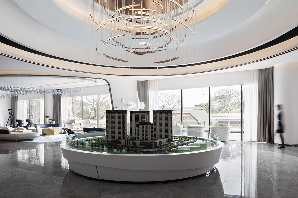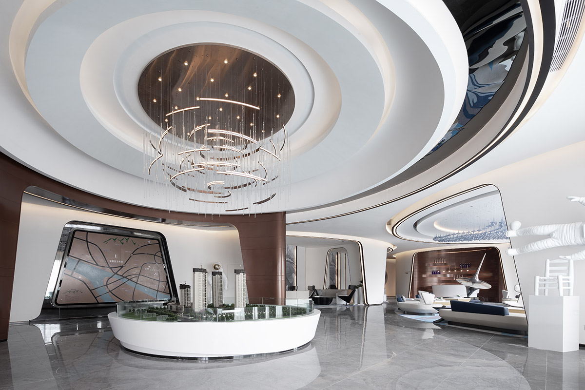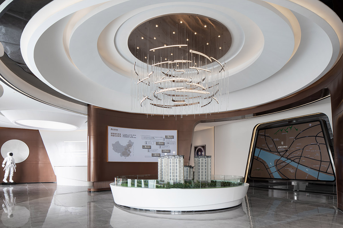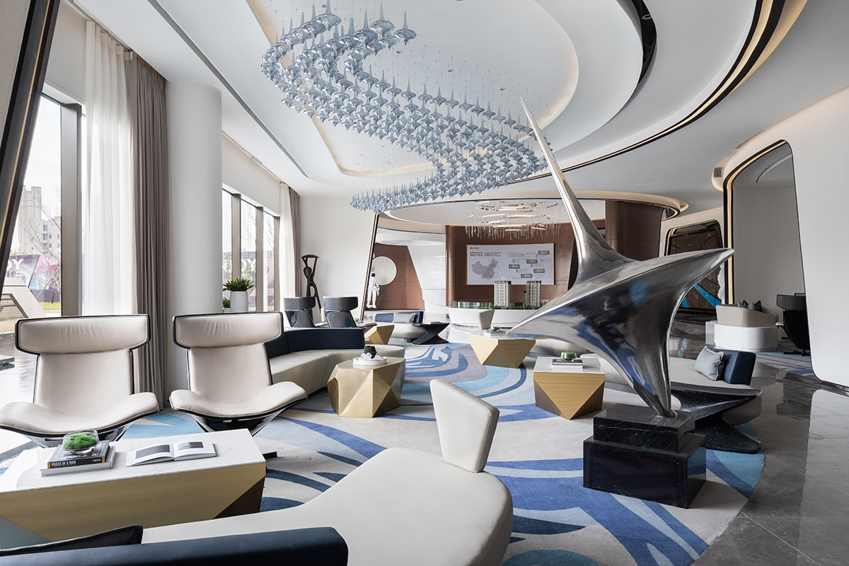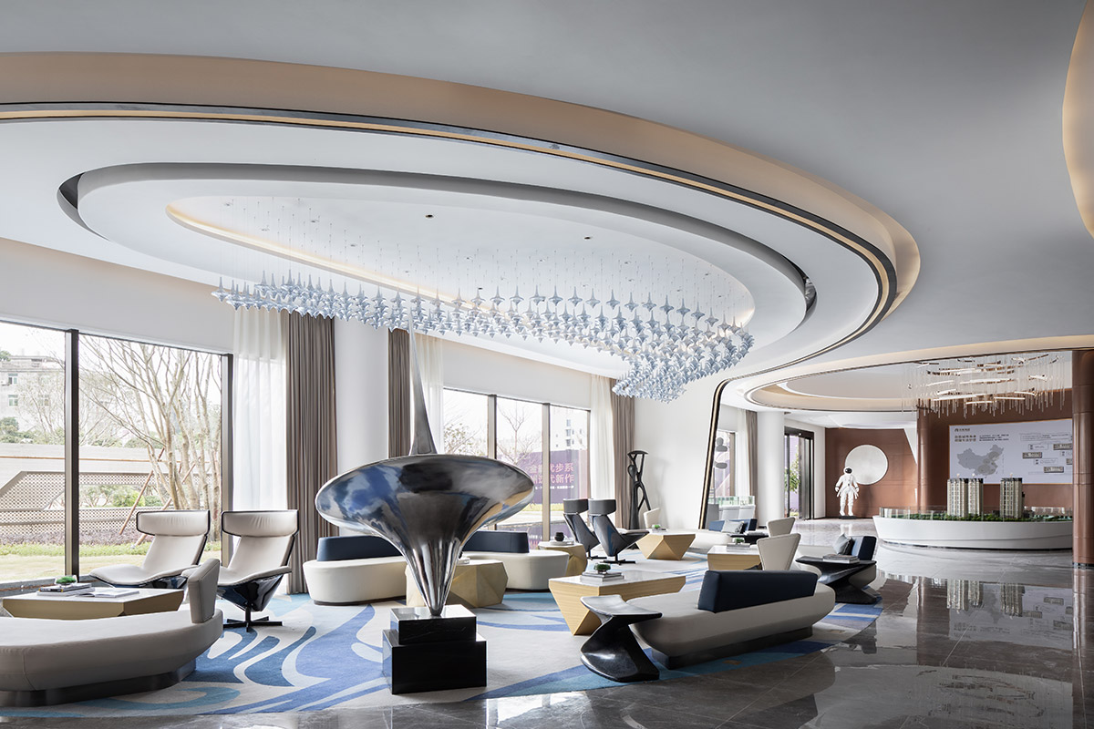项目沙盘置于场地中间,配合区域地图,压住空间气场,凸显销售中心的功能所在。吊灯悬挂于空间中央,运用曲线进行一种全新解构与重组,流动的曲线相互层叠,宛如众星环极。太空人物雕塑富有张力的艺术表达,与空间的调性相互呼应,让人如梦似幻的虚实之间展现出一种隐约、朦胧的未来感,具有强烈视觉冲击感。