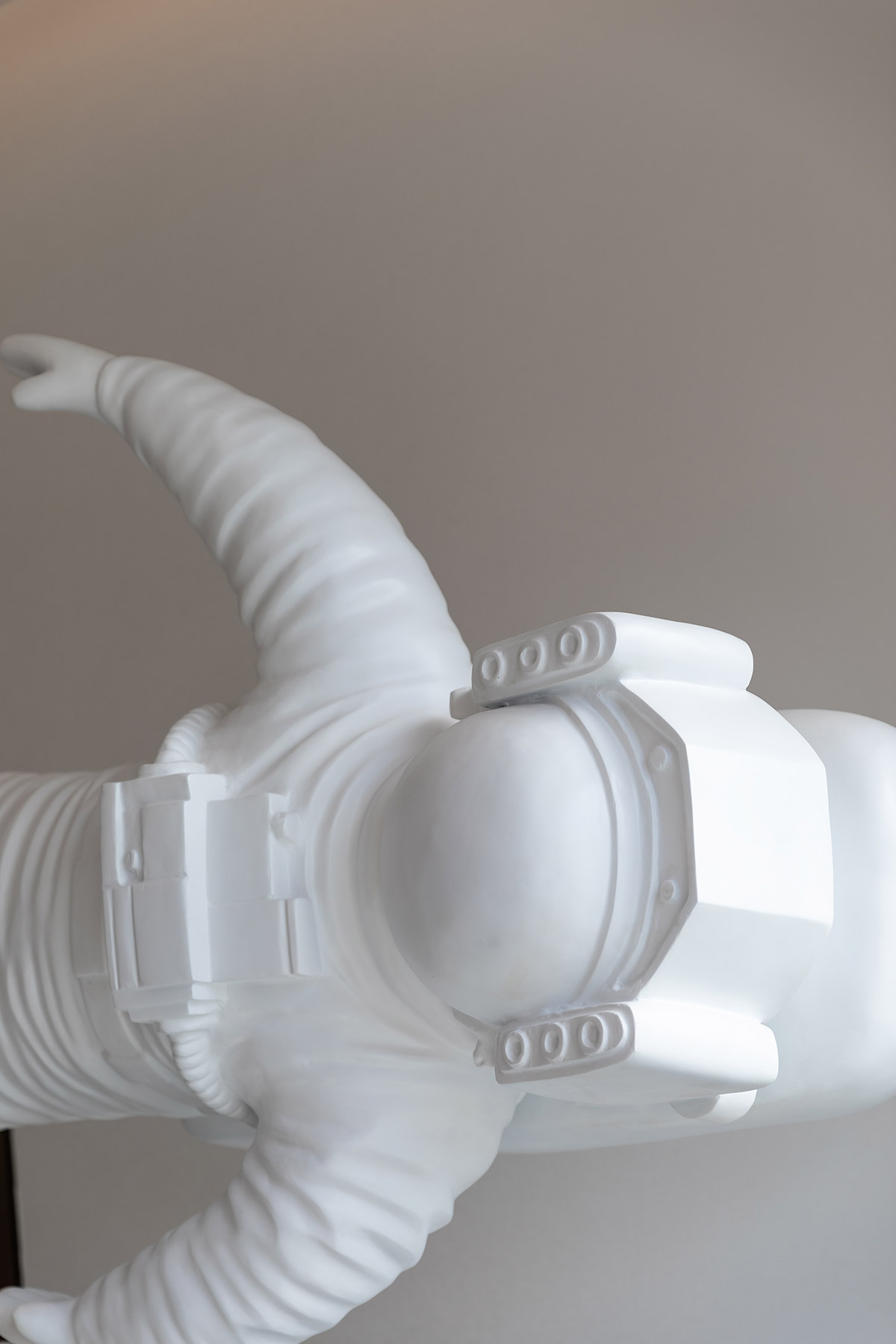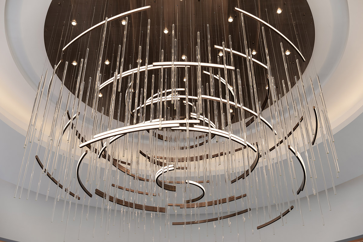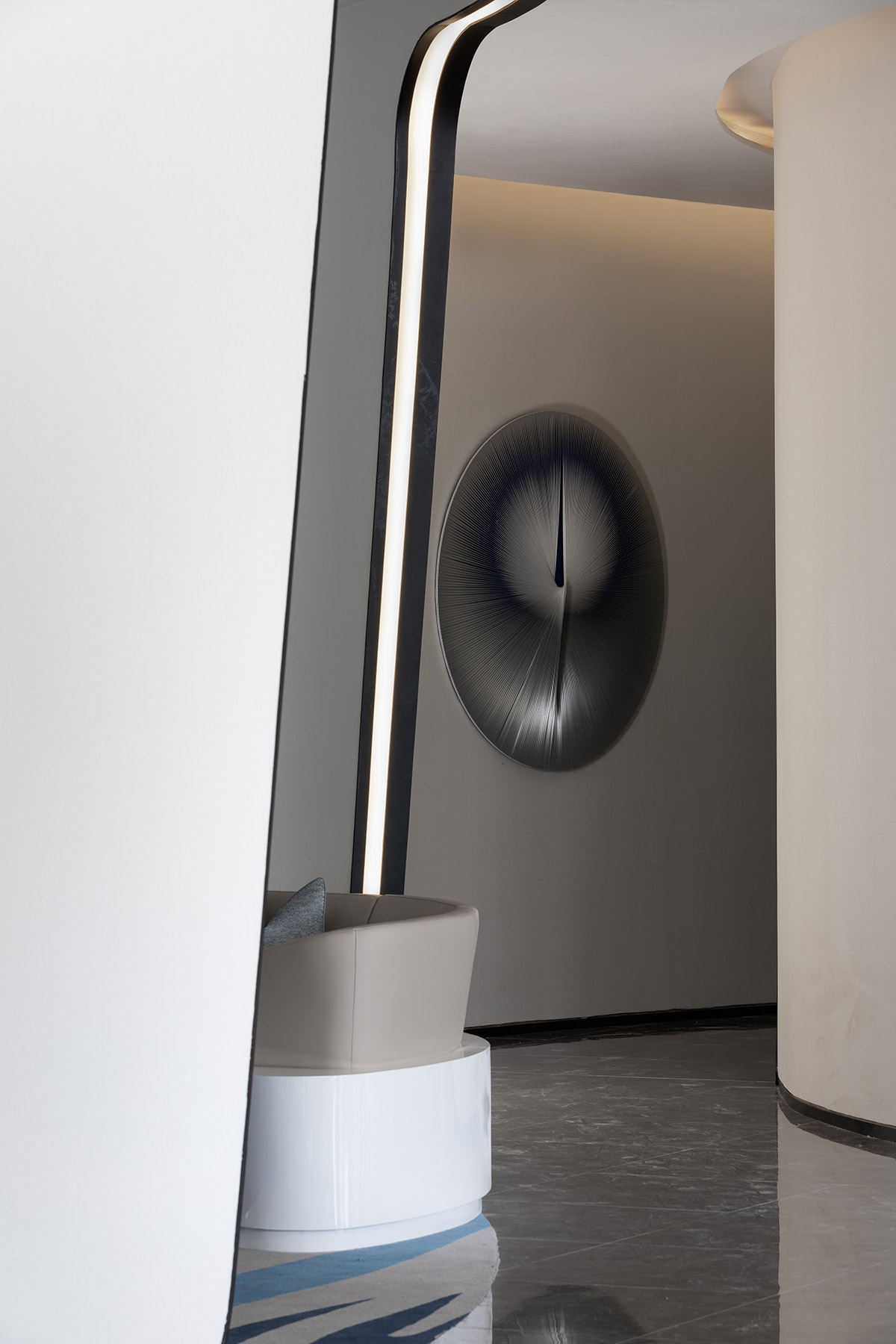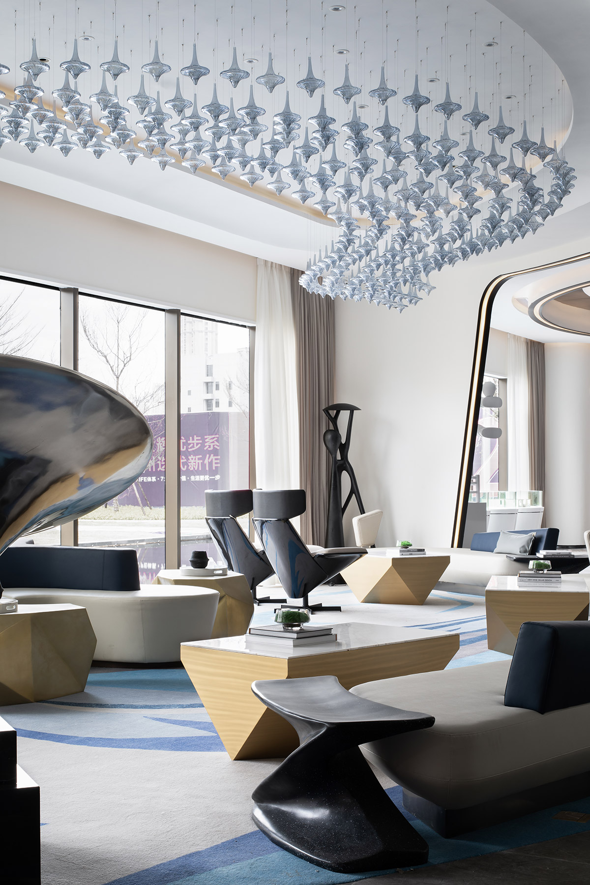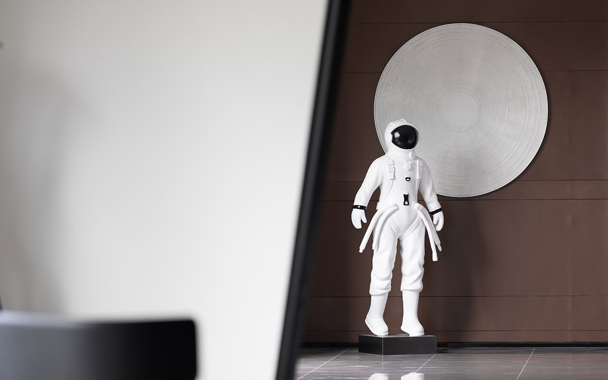 项目沙盘置于场地中间,配合区域地图,压住空间气场,凸显销售中心的功能所在。吊灯悬挂于空间中央,运用曲线进行一种全新解构与重组,流动的曲线相互层叠,宛如众星环极。太空人物雕塑富有张力的艺术表达,与空间的调性相互呼应,让人如梦似幻的虚实之间展现出一种隐约、朦胧的未来感,具有强烈视觉冲击感。