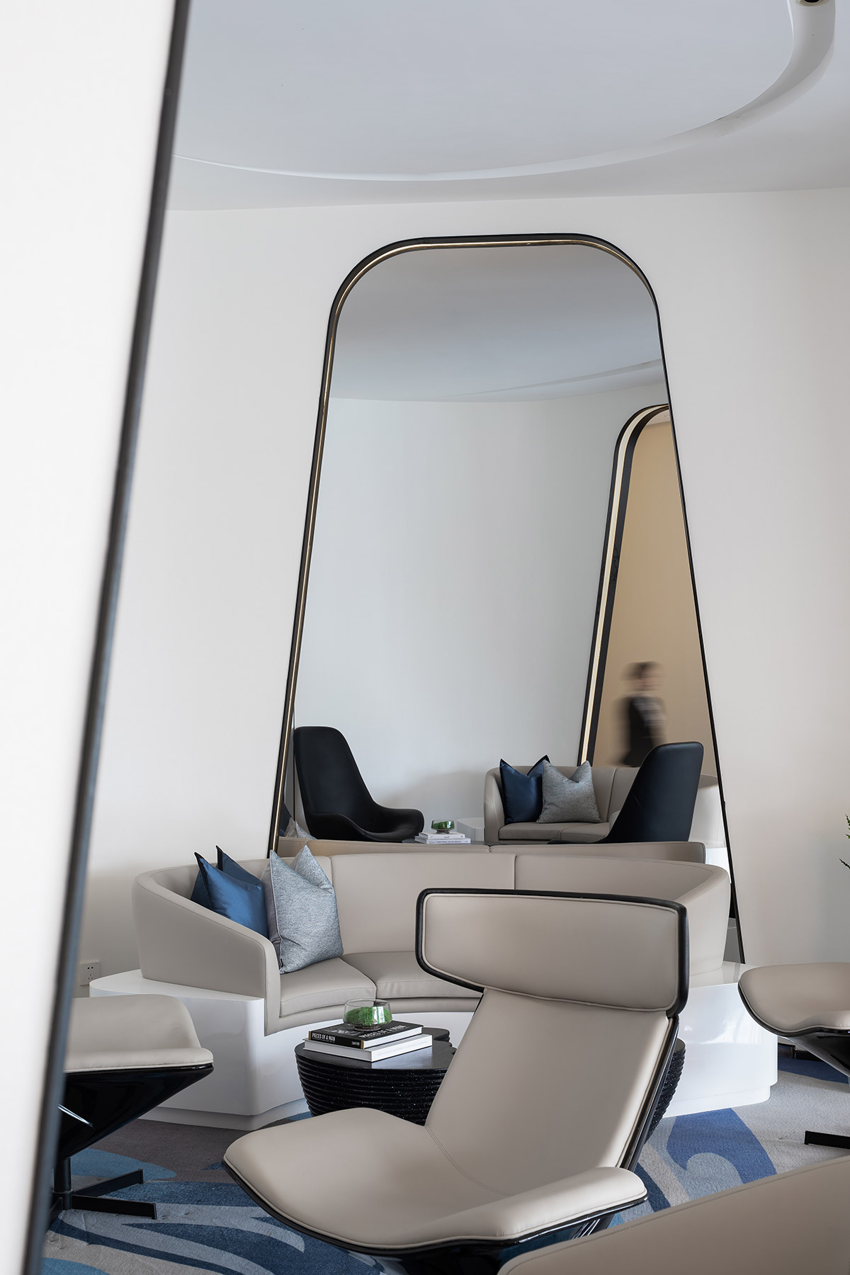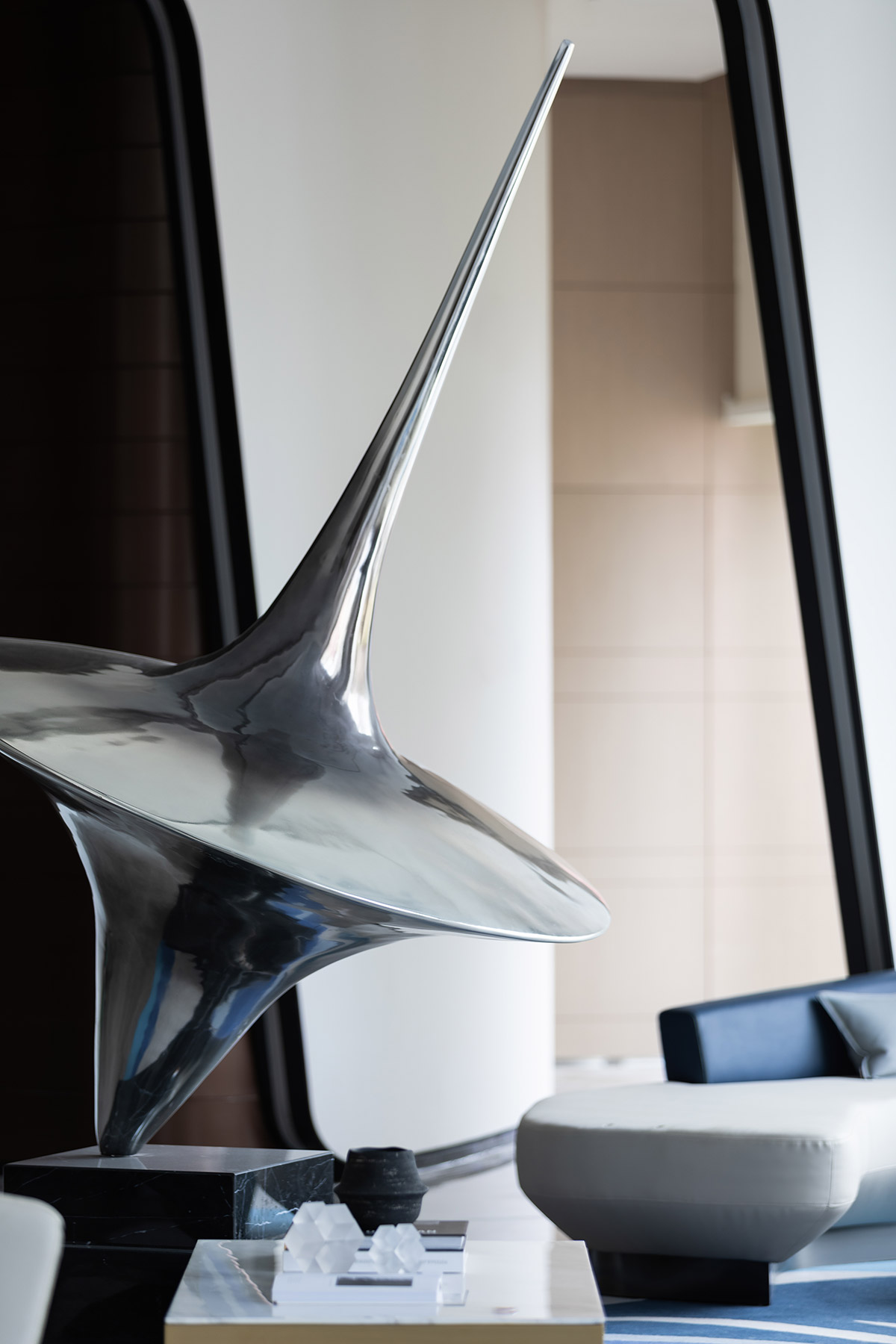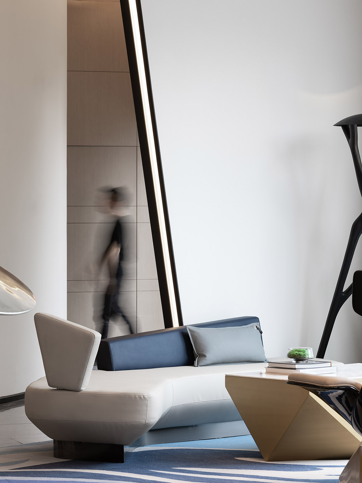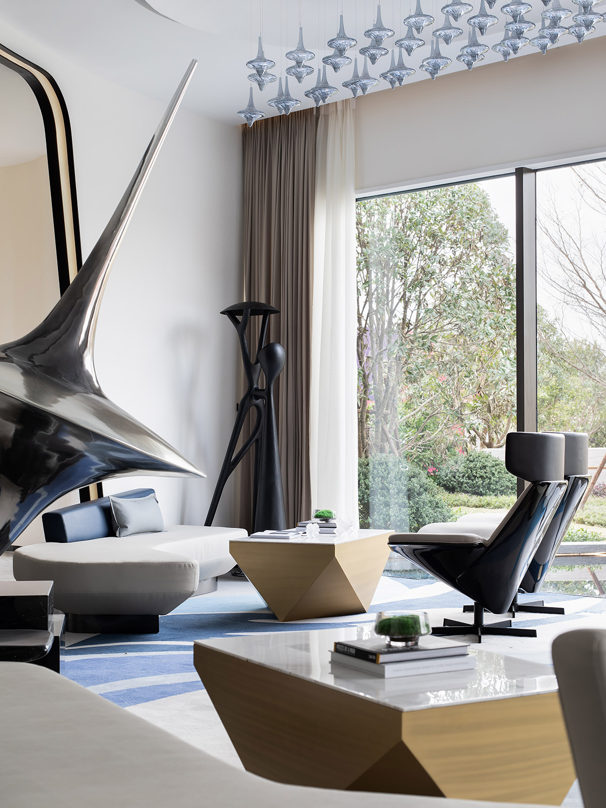 线条柔美却不失硬挺的沙发,棱角分明的金属几何形茶几,科技感十足的单椅,互相牵引,如浩瀚宇宙中漂浮的天体行星,让人置身于奇幻的“梦境”之中。