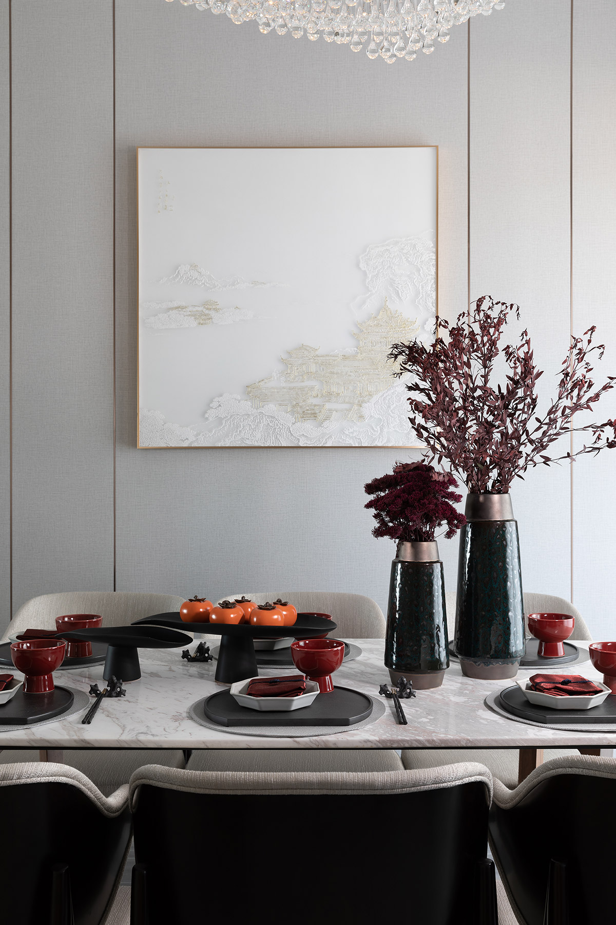 餐厅延续了东方的端雅稳重,名山胜川的装饰画镌刻着古代诗性的肌理,赋予空间内敛含蓄的艺术风韵。水晶的灯饰组合、雅致的餐具、光洁釉瓷花器、橙柿梬楟摆件,都附予空间一层氤氲意境,中式意蕴的艺术特质一展无遗。