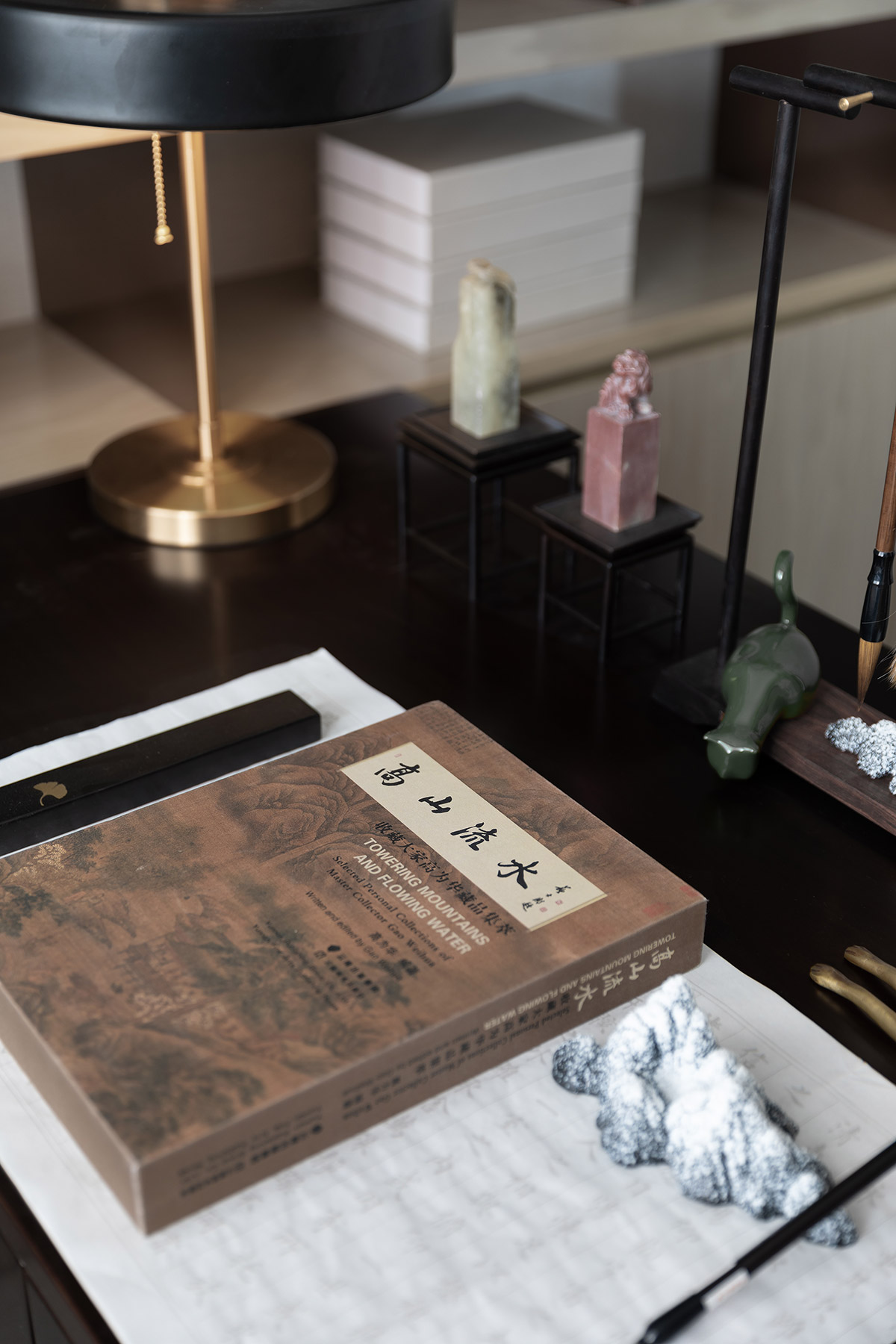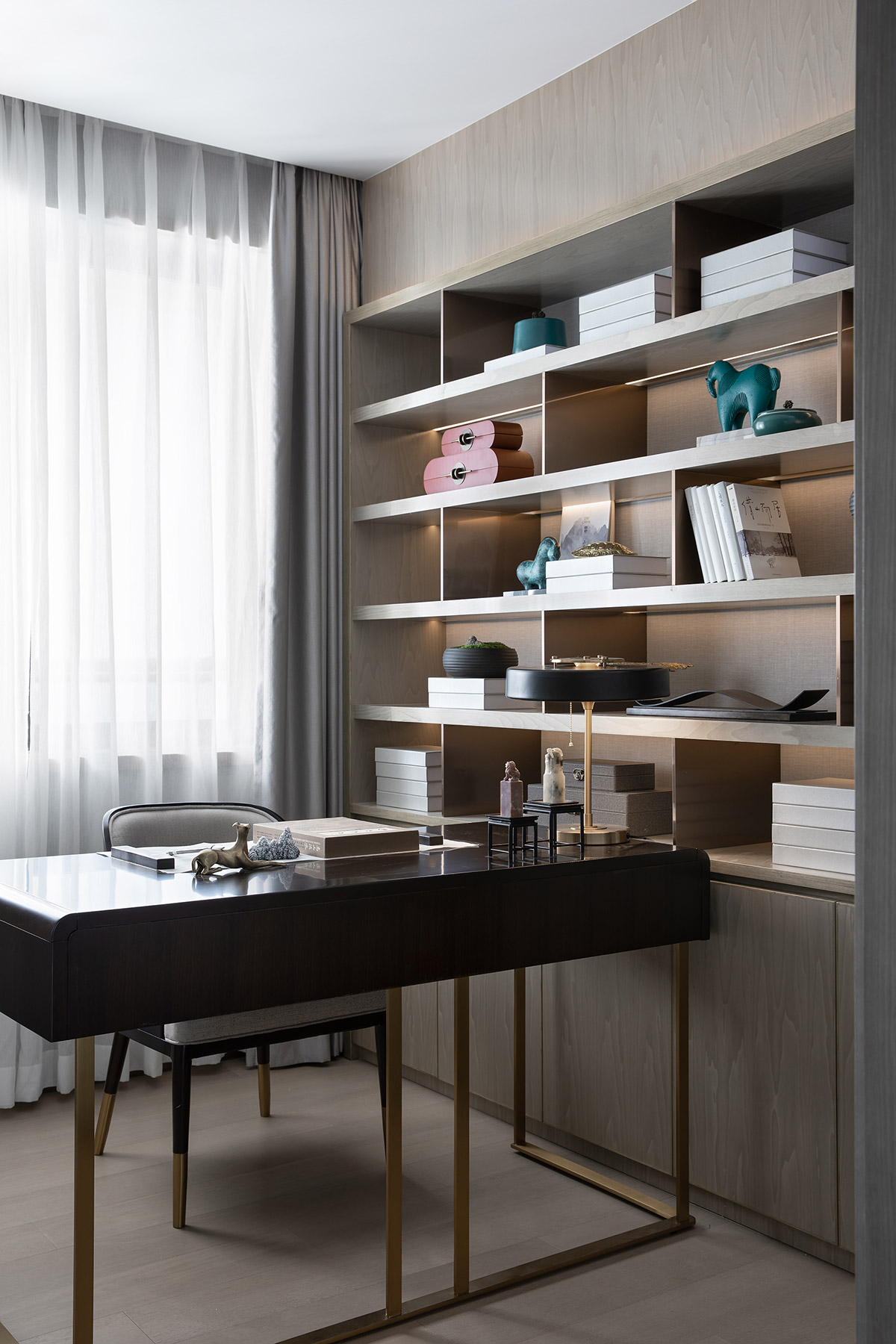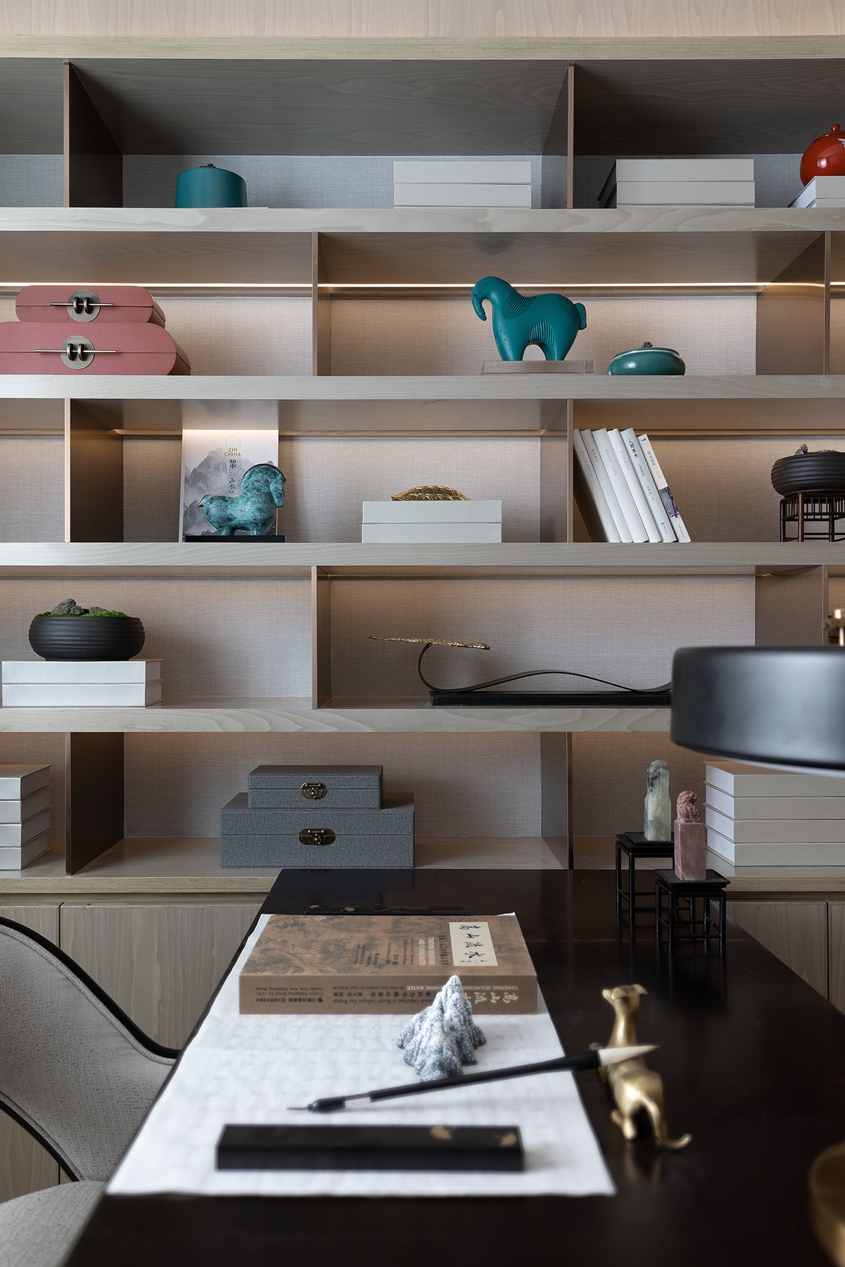 书房的东方韵味,在于文墨气息,此间书案与文房四宝俱齐,书架上的卷帙与青铜色器物凝聚古香气质。