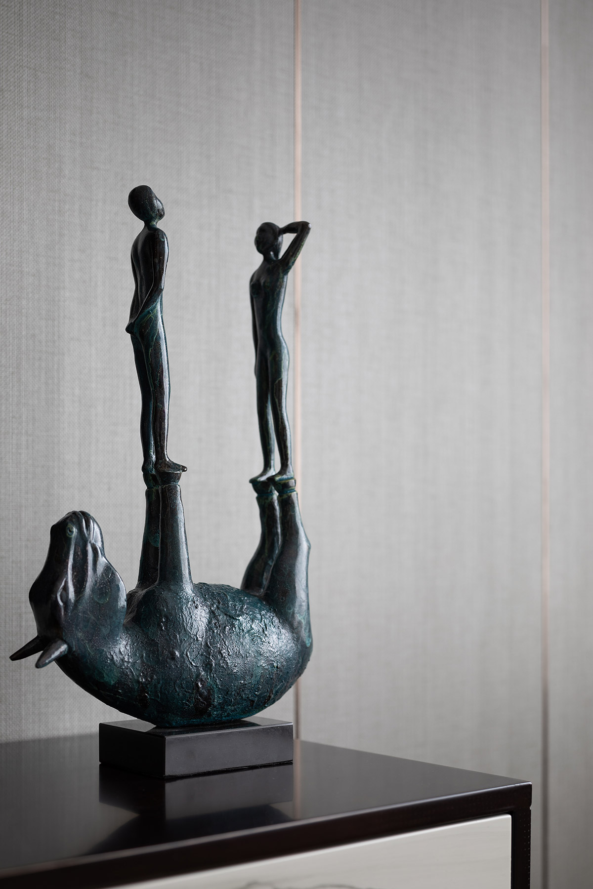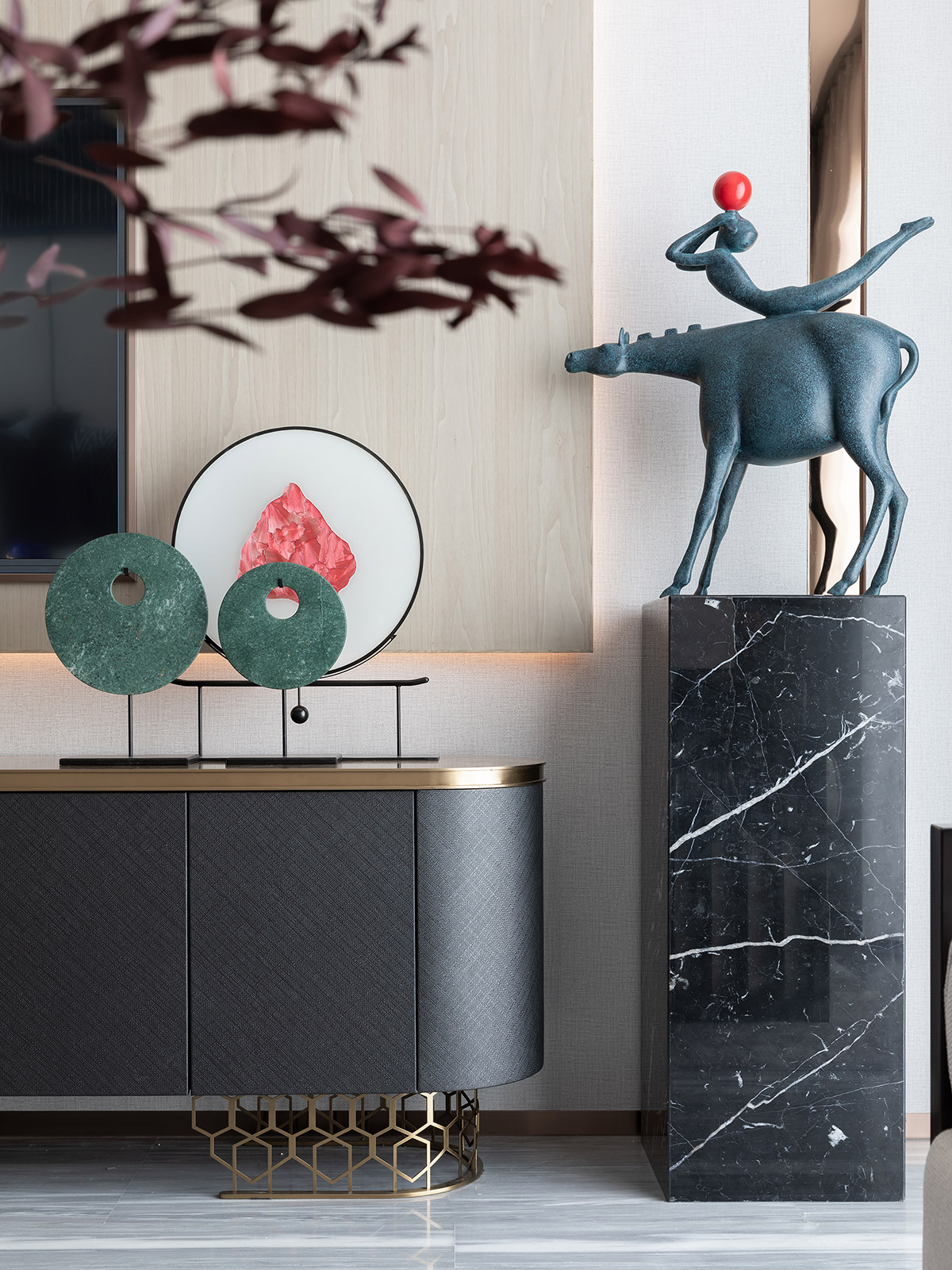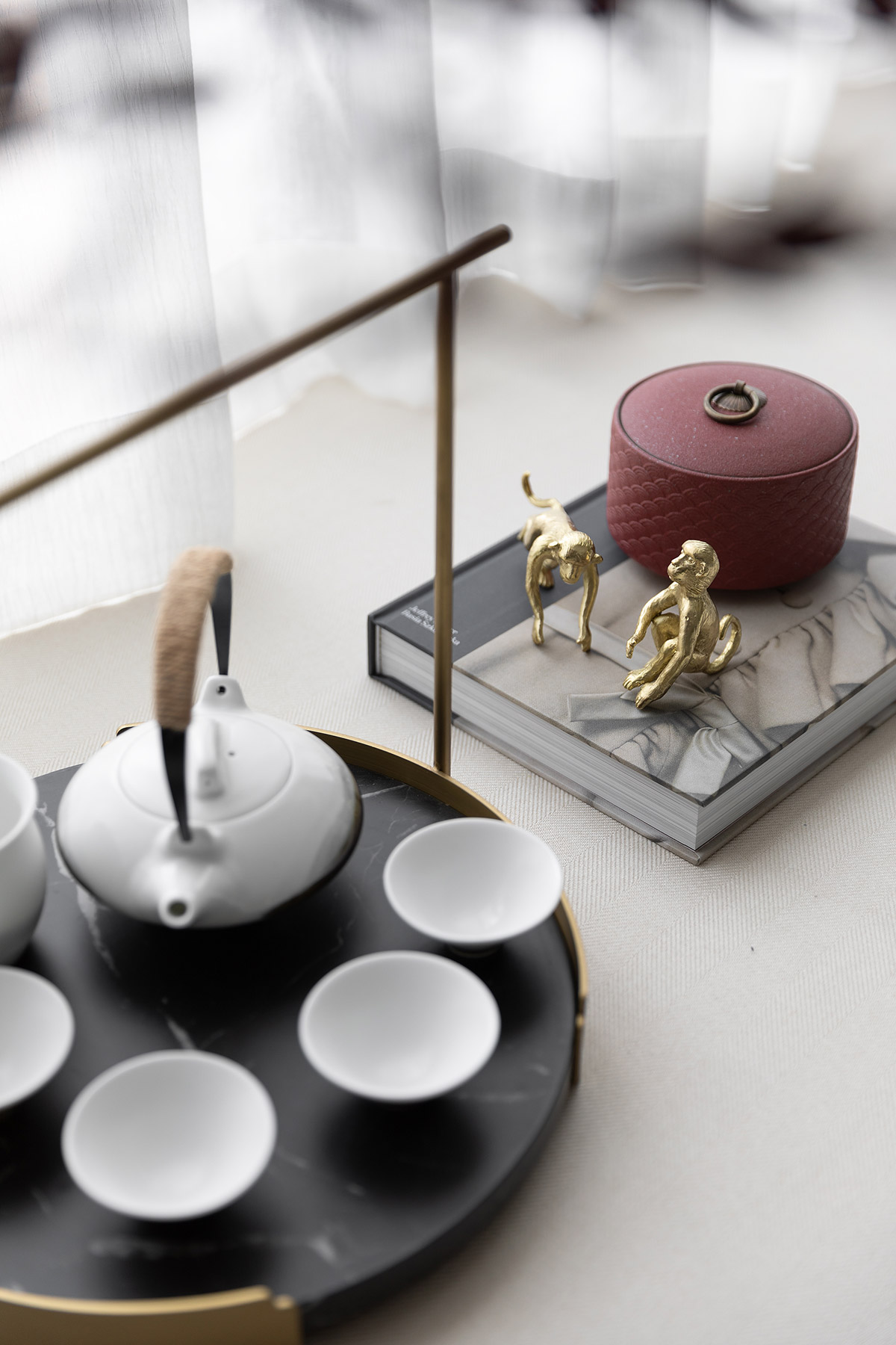 阳光透过轻纱漫入房间,青铜雕塑、灵猴摆件仿佛被赋予了生命,跳动在空间。闲暇之余,一盏清茶,聊寄浮生乐事,尽得生活意趣。