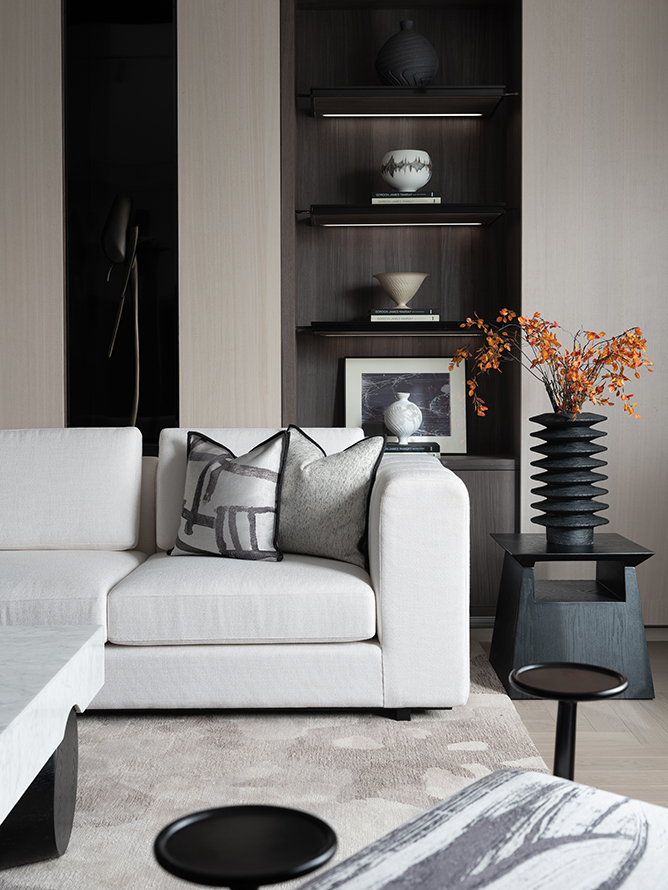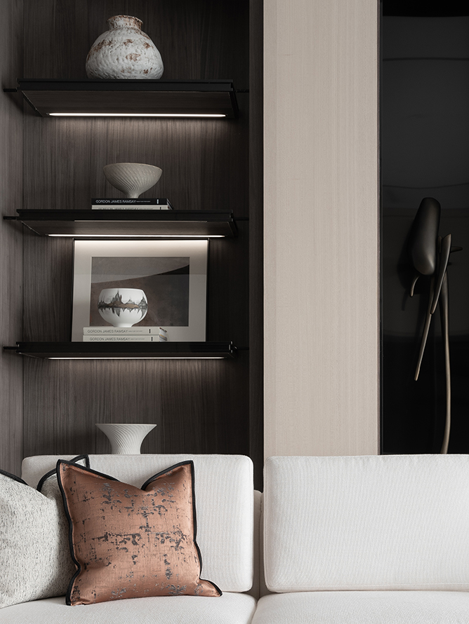 沙发背后摆放着的定窑器皿,如同押韵却又不重复的诗词,颜色及肌理的对比,是一种设计艺术的演绎。