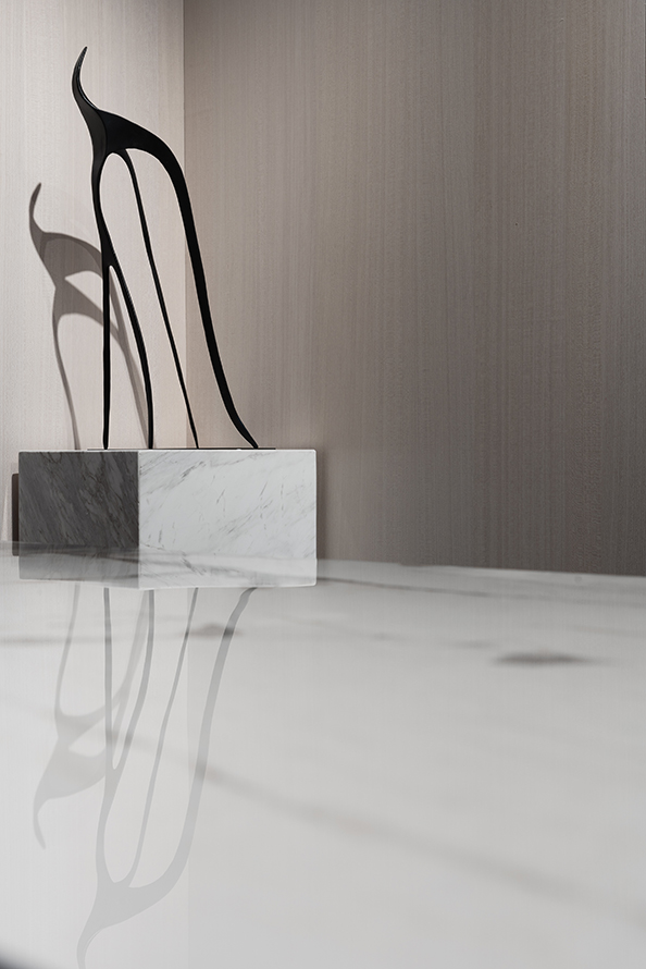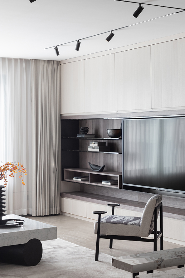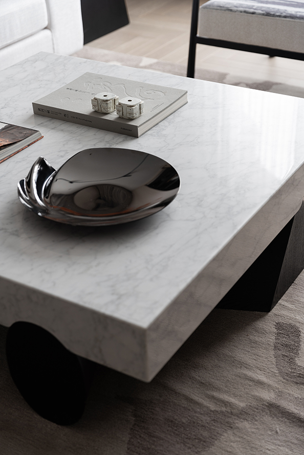 原木与大理石,两种材质以极简的方式,构成了整个客厅空间的清冷底色。