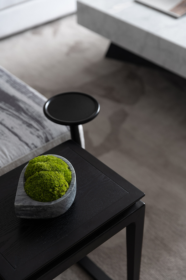 木色的墙面代表温润,深色的柜面表达了沉稳,爵士白搭配的单人椅则为清爽,加上绿色苔藓植物的跳跃点缀,黑与白、硬与软,不同材质和色彩的碰撞,是藏在舒适下的视觉灵动感。