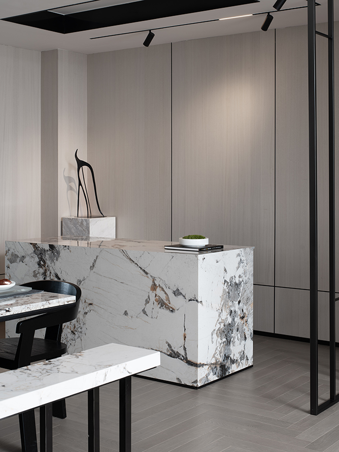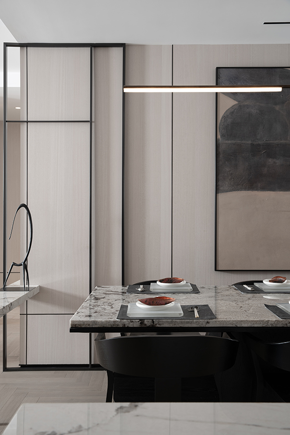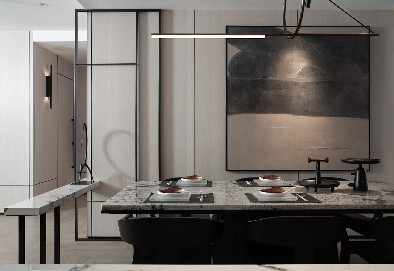长条形的中岛吧台让餐厅空间拥有了相对的独立感,同一块大理石的使用,象征餐厅空间的共通性,并透过沉稳的石材达到融洽和呼应。