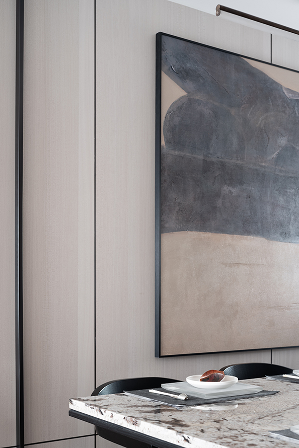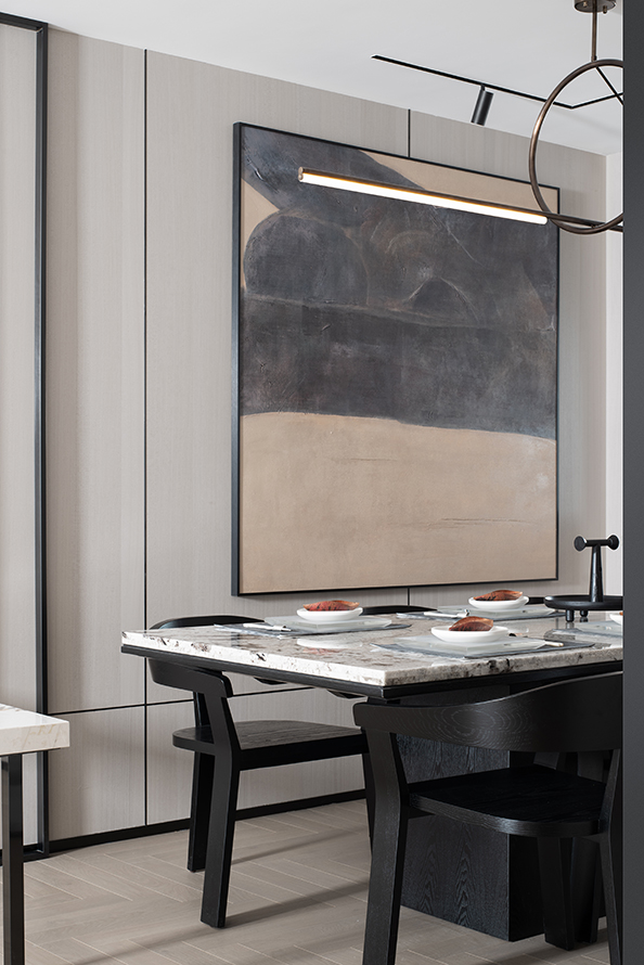 墙面的大幅装饰油画,呼应了“定窑”的色彩,如晕开的胭脂,增添了空间的灵动与平衡。