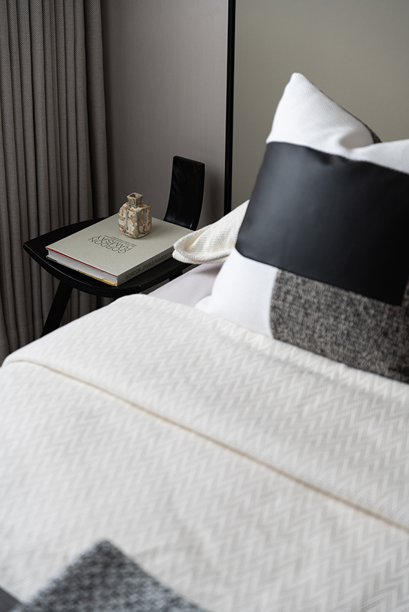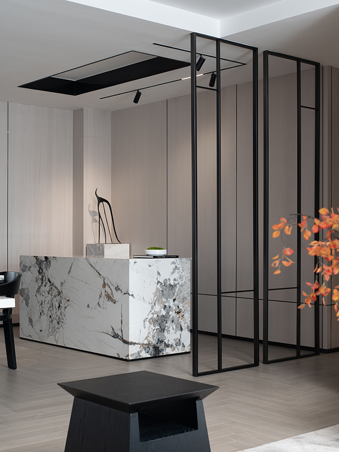 用定窑为引子,结合宋代美学,当代黑白灰硬装,加上古韵的软装,是传统元素的现代演绎,也是回归纯粹简约的概念。