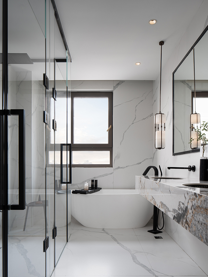 盥洗室的墙面与地面采用水磨石砖一体的设计,在视觉效果上更为整体,洗手台使用的大理石面,与客厅、餐厅使用的为同一块面,让卫浴空间散发出与整体空间共同的视觉魅力。