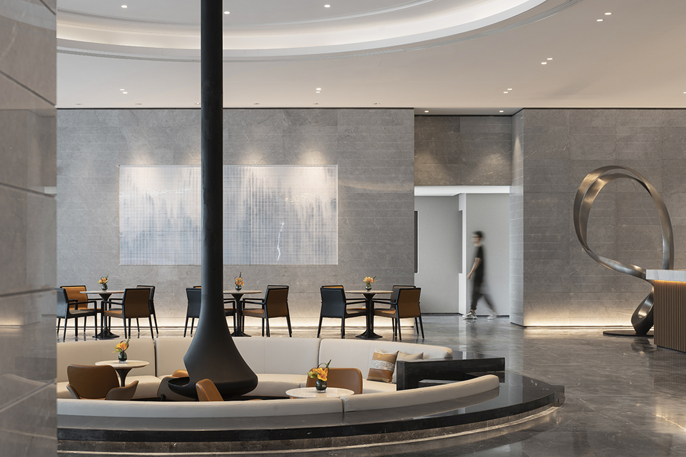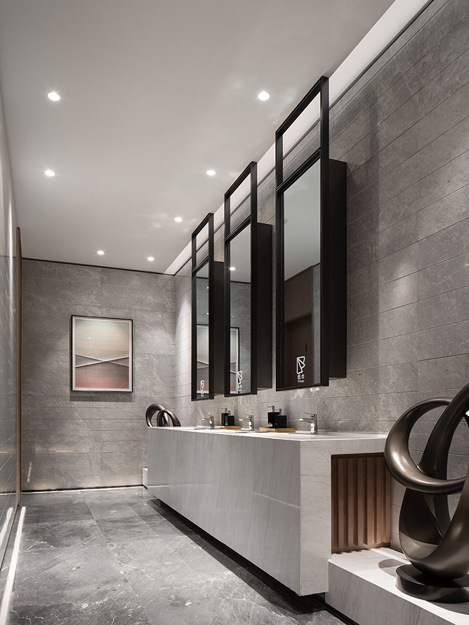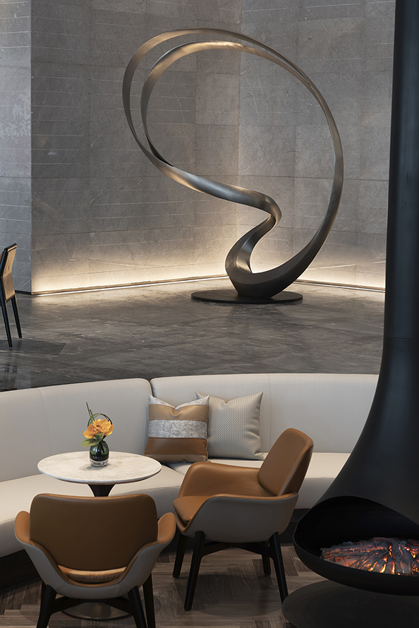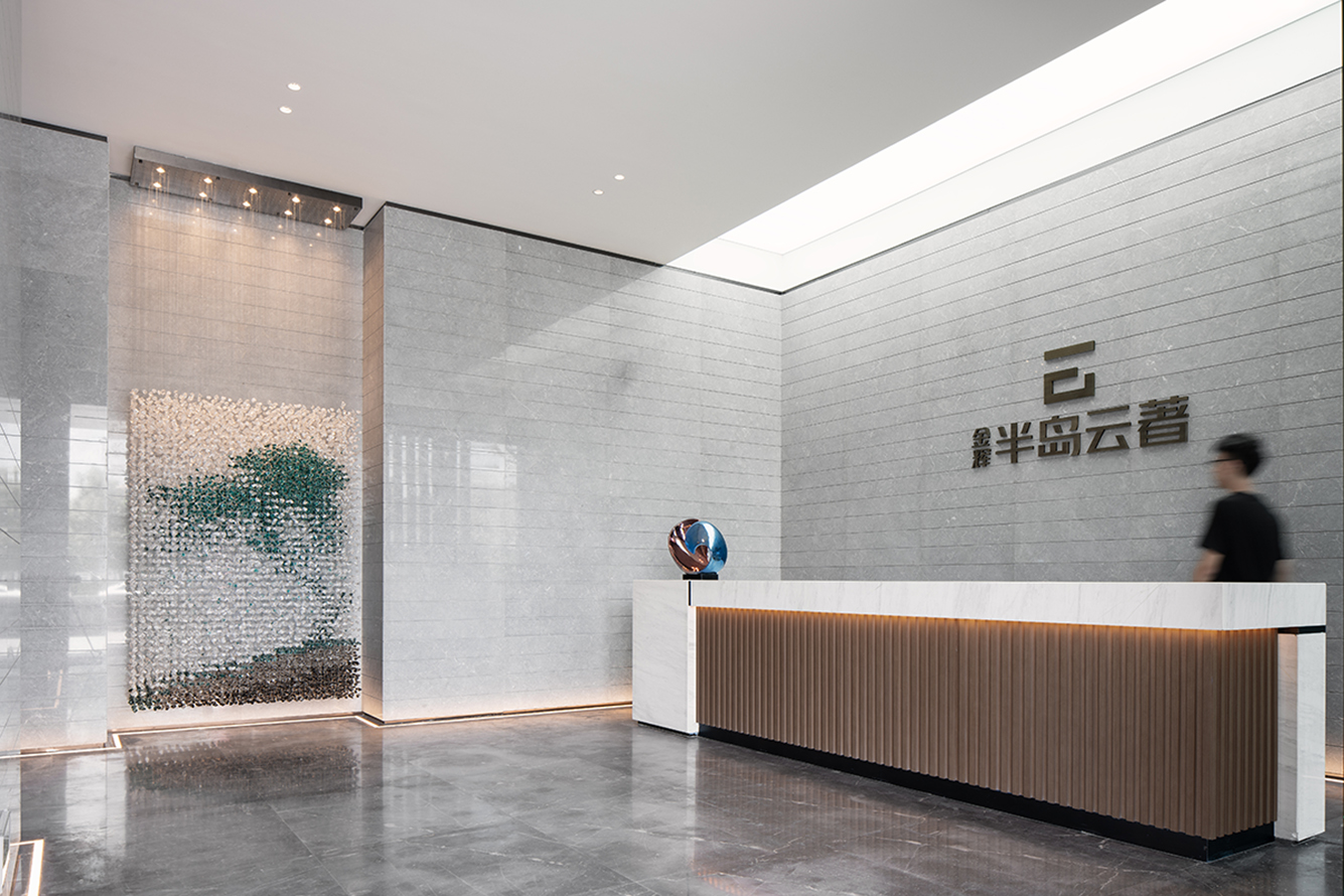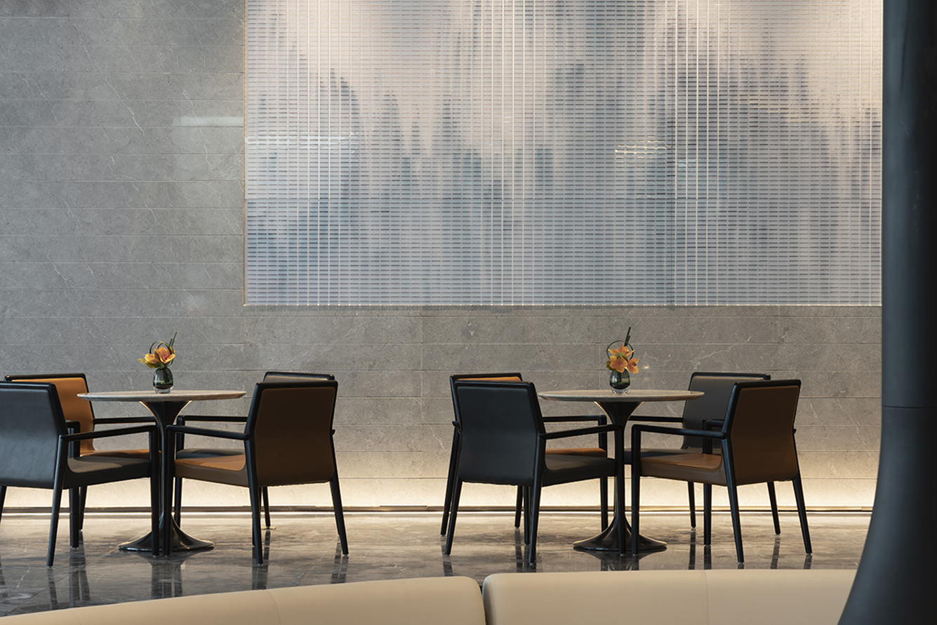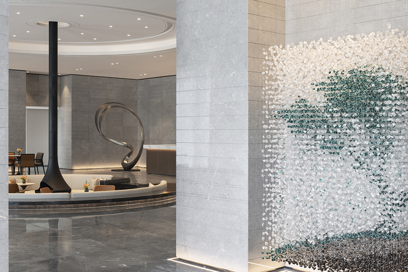 墙上的艺术装置画,宛如河水缓缓流淌,无声无言见证着人来人往,倾听着、见证者大自然的馈赠,用以捕捉波光粼粼的水纹动态,将之凝固于静止的瞬间。