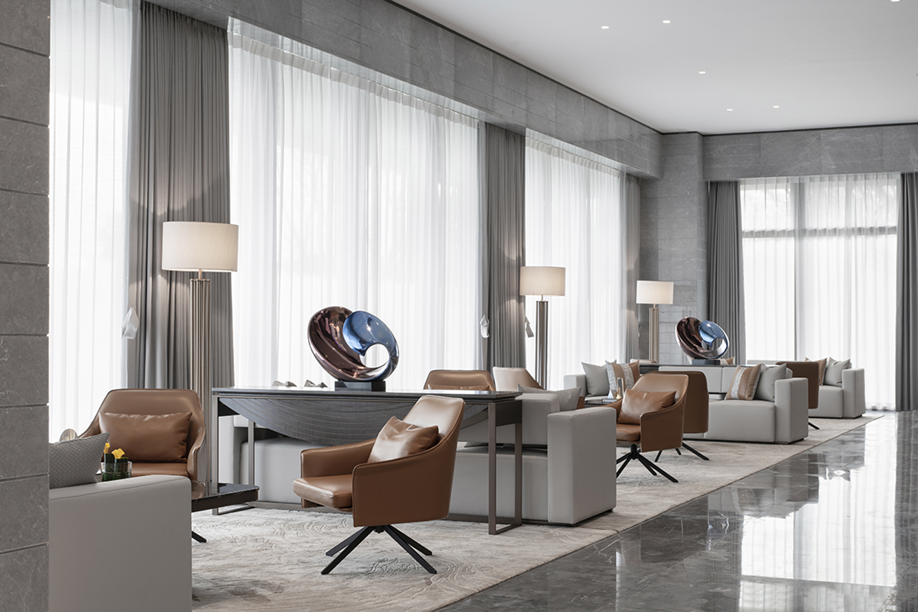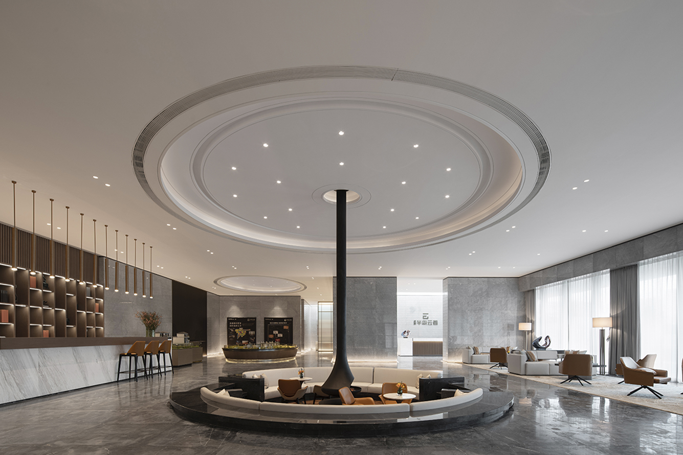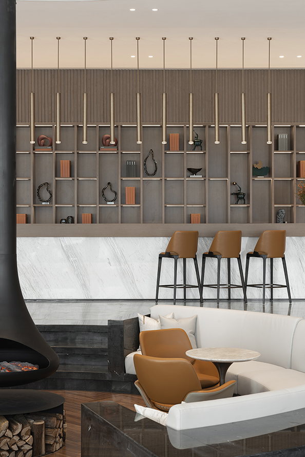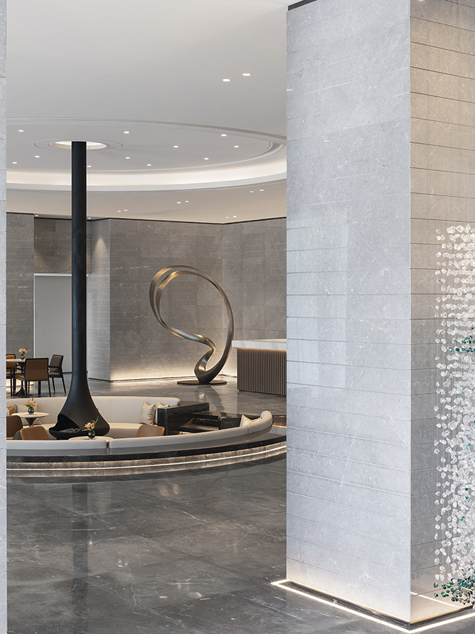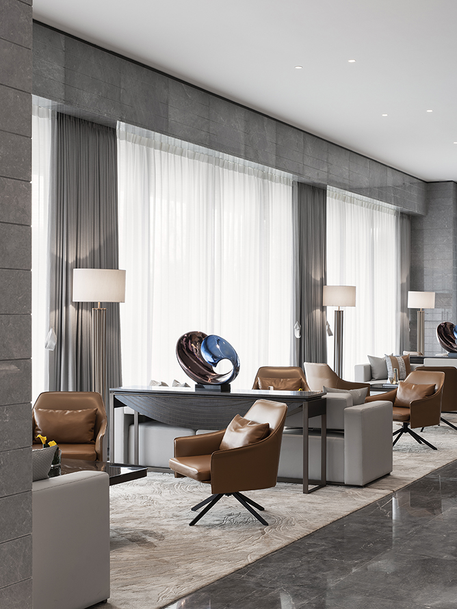 整个空间格调明快柔和,造型线条简洁,串入精致金属、亮光石材,暖色皮革,自然木材等奢华材质,组合编织了一个华丽温暖的栖息场所。