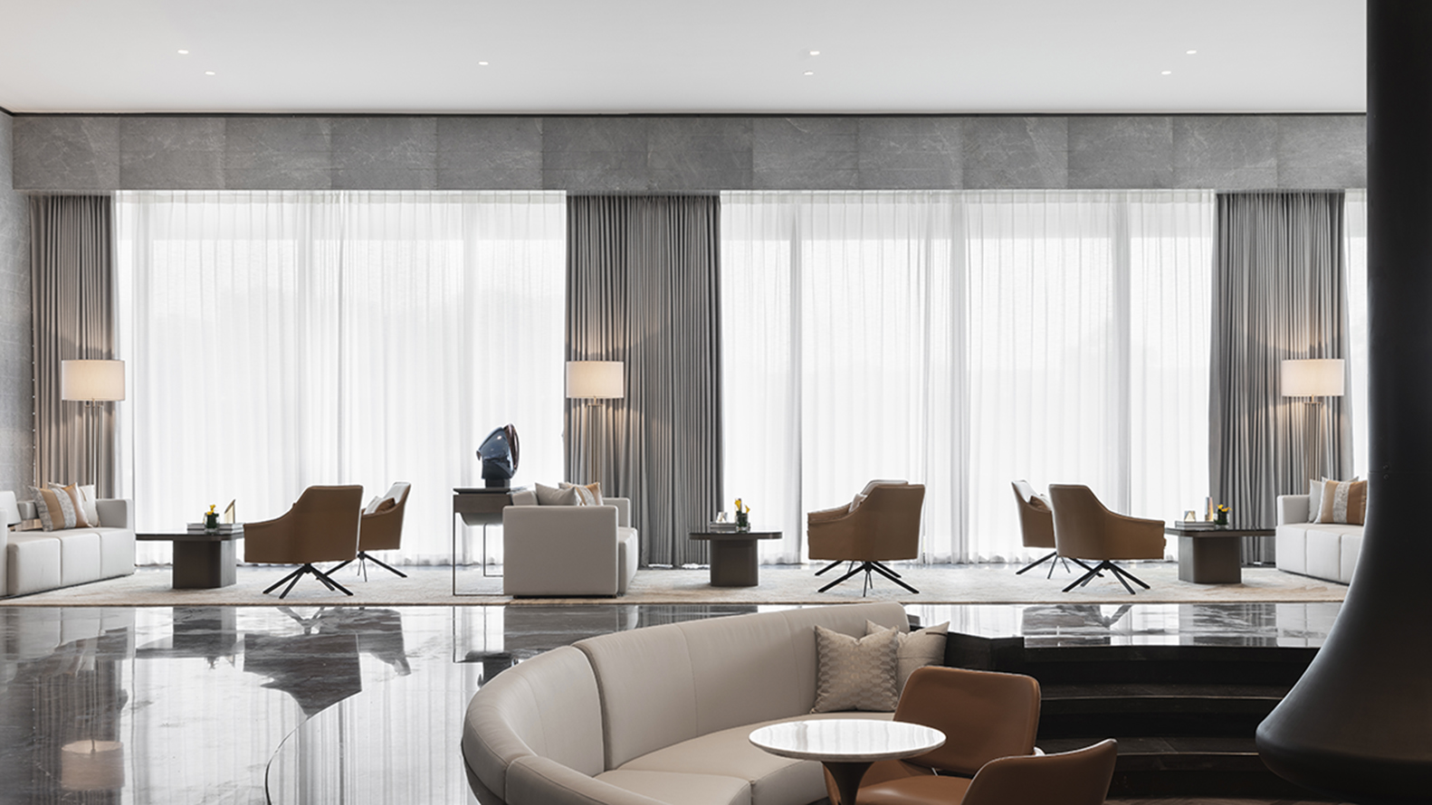 窗外的景色透过玻璃投射在深度洽谈区,光影效果叠加, 树影也摇曳飘摇,与地毯上的纹路交织呼应,仿佛风轻抚过来……