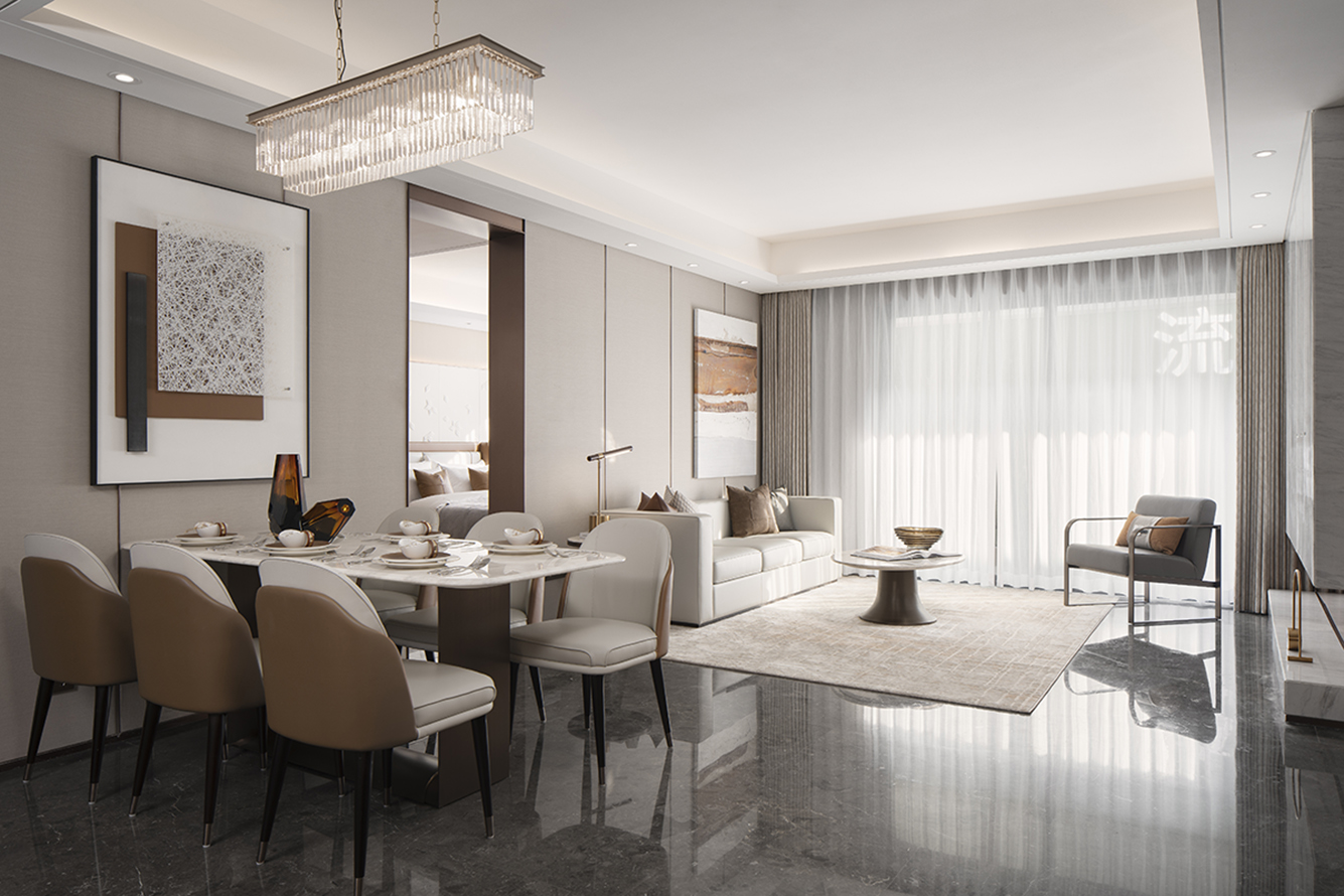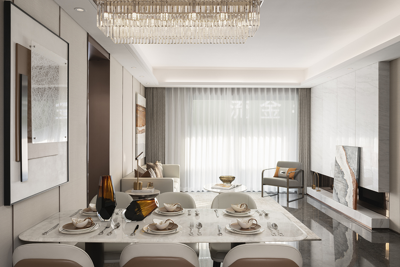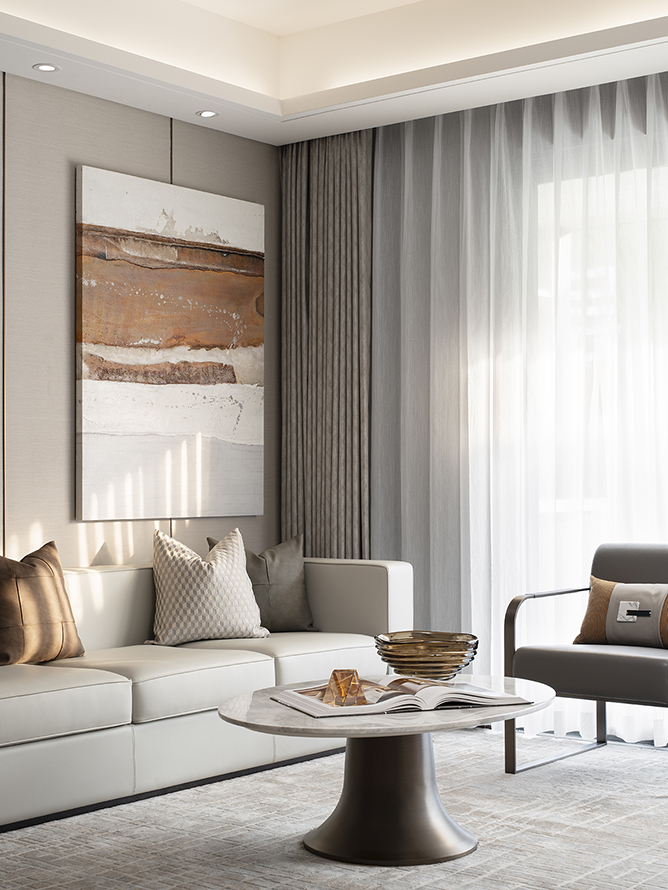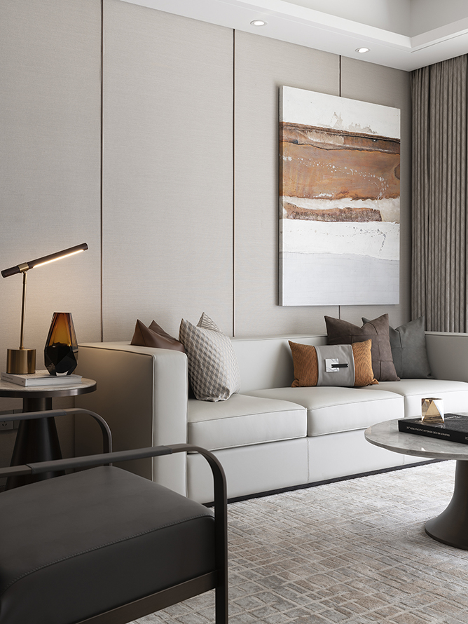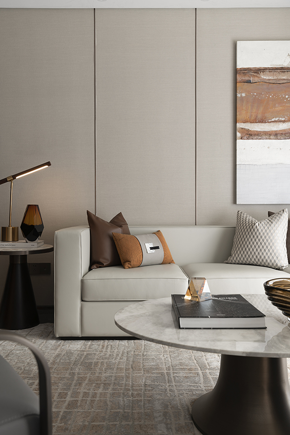 客厅空间格调明快柔和,我们选用造型线条简洁的家具,串入亮光面大理石,再利用暖白色皮革、哑光漆木饰面等不同材料,在整个空间中拼接、转换,强化了空间整体性,焦糖色沙发抱枕则提供了视线焦点,温暖的点光源创造一种舒适又轻奢的独特氛围,组成一个华丽温暖的栖息场所。