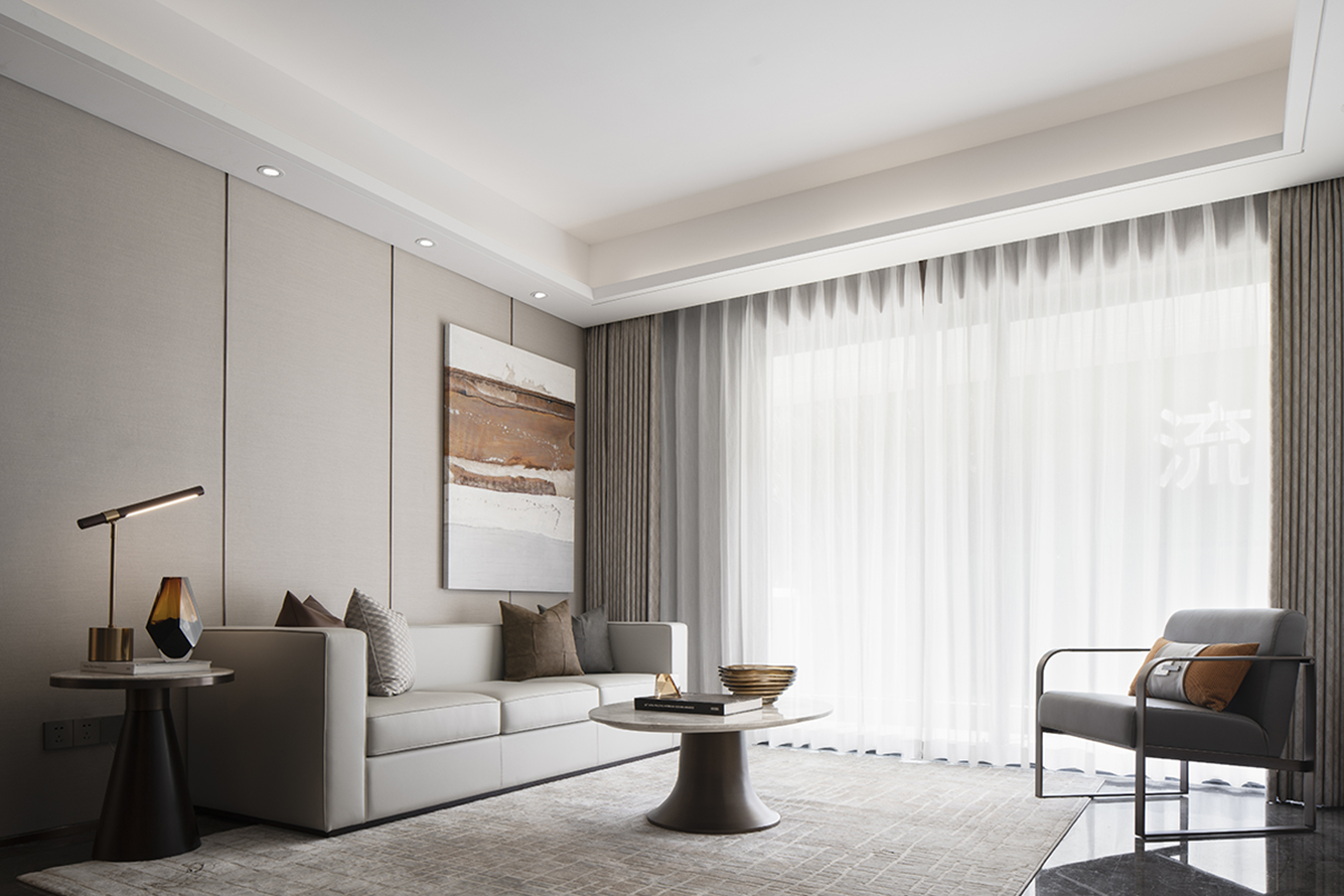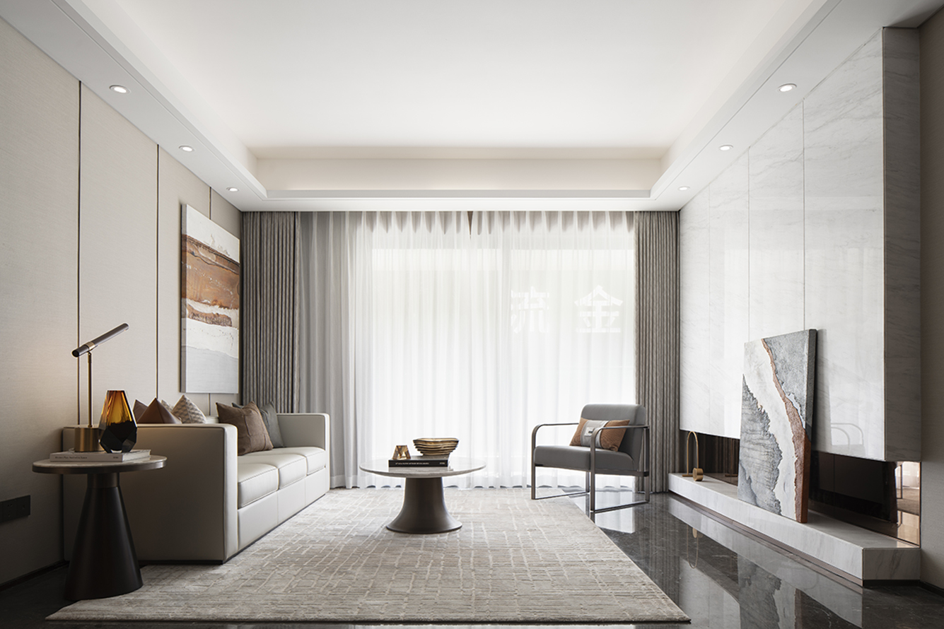 在客厅空间的简约设计中,利用了金色金属线条穿插其间,恰到好处地提升空间质感,极显轻奢气质。