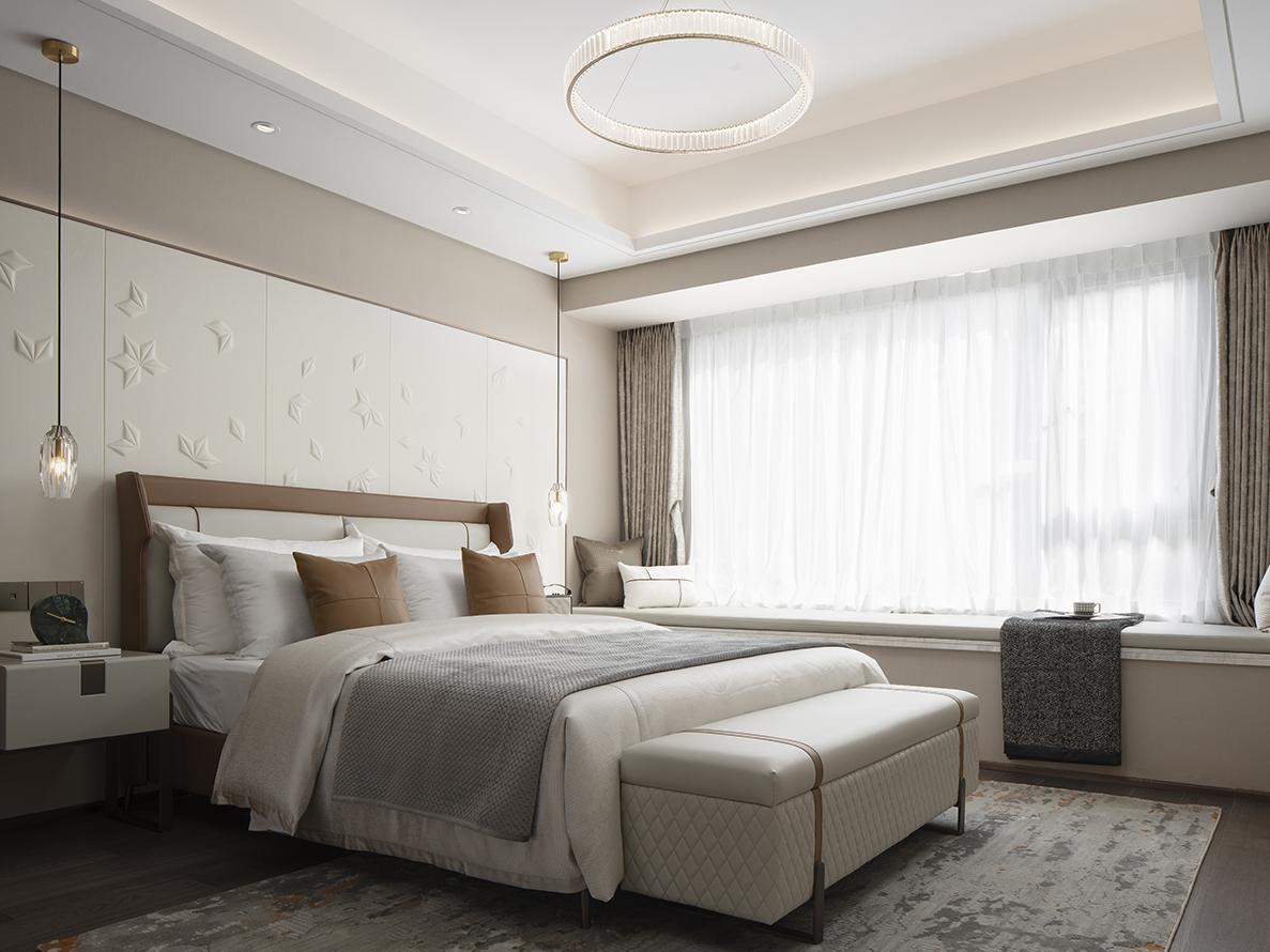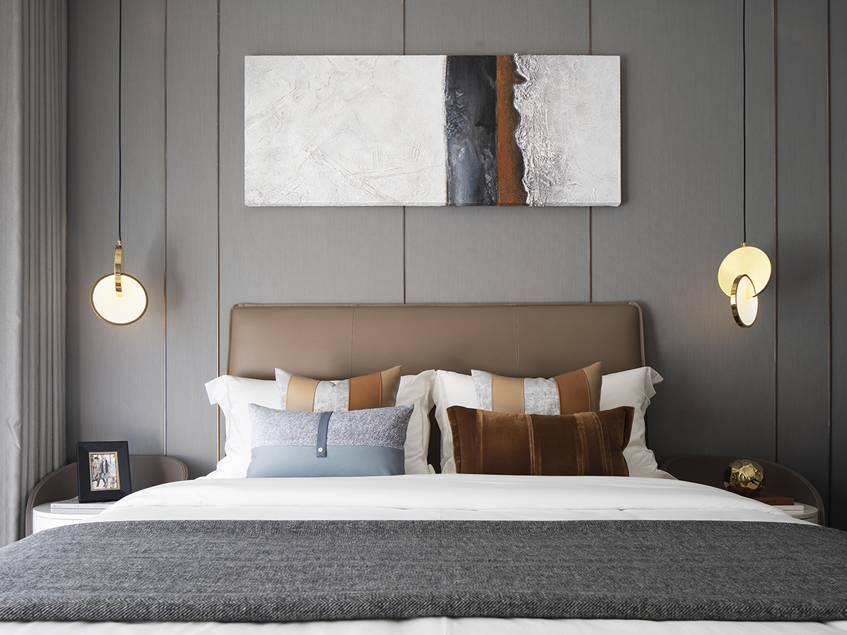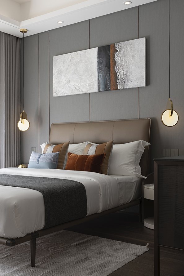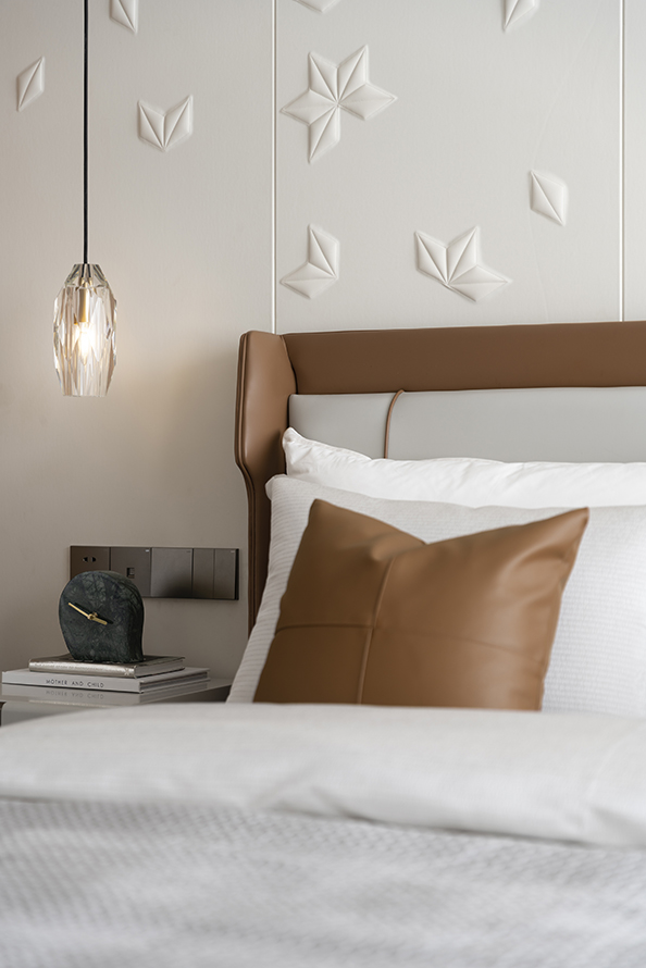 长辈房赋予空间“海上生明月”的意向,窗外的月光洒了一地,月下树影斑驳凸显出它们原有的形态,在此意向中融入现代的几何表现手法,与不同材质的碰撞,稳重而不失轻奢时尚。