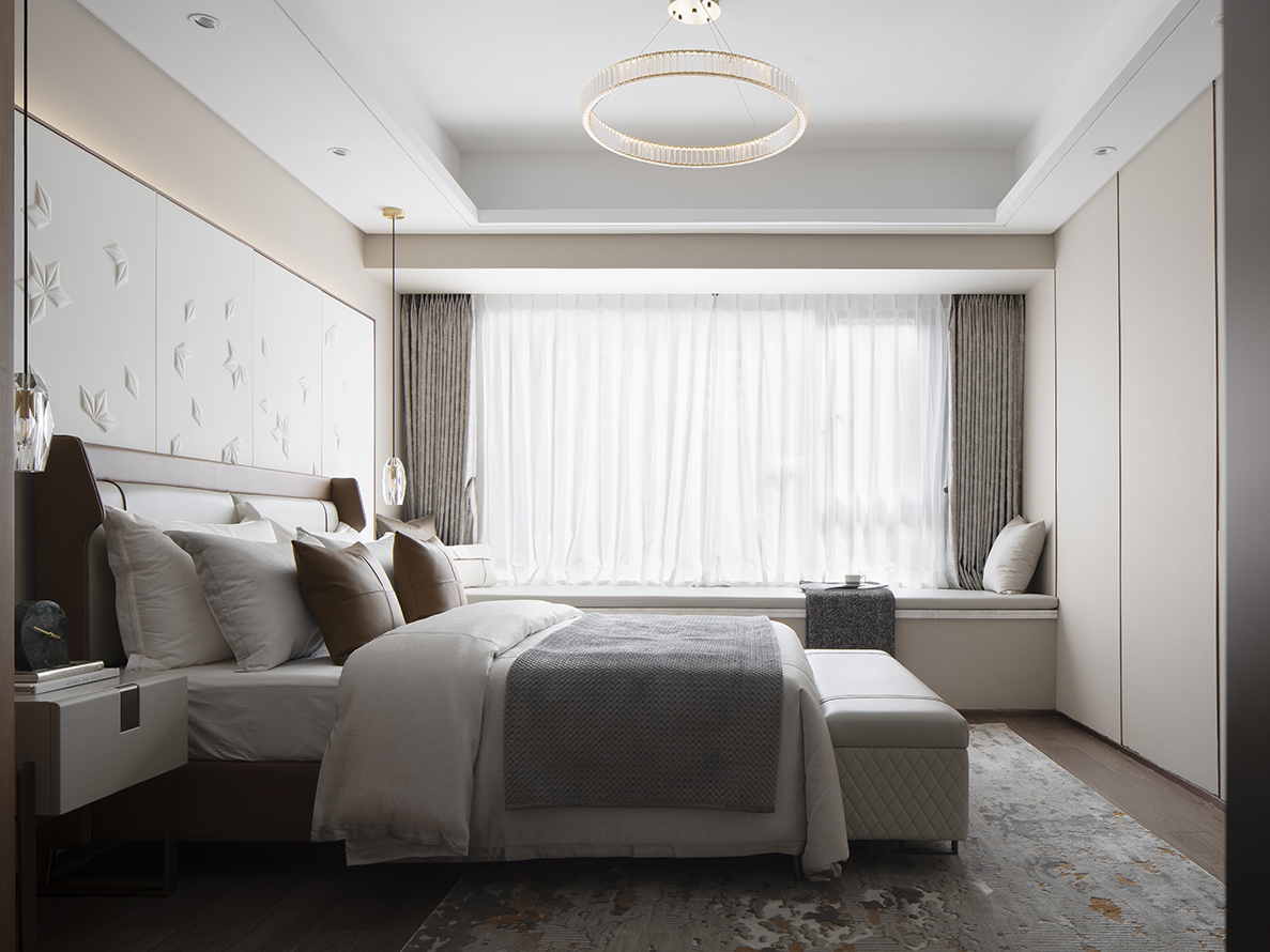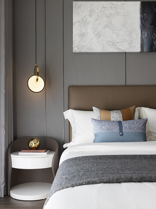 主人房延续了整个户型明快柔和温暖的调性,线条明快的家具搭配色泽柔和的木地板,落地窗外的自然风景成为了房间中最美的景致,同时营造出和谐舒适的感觉。