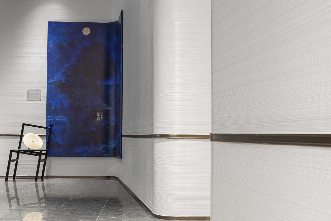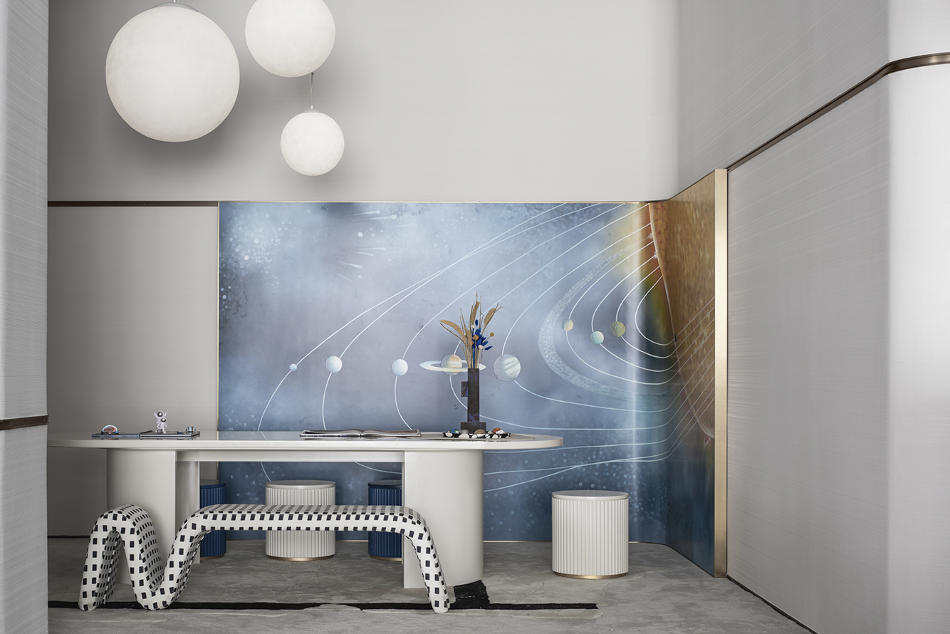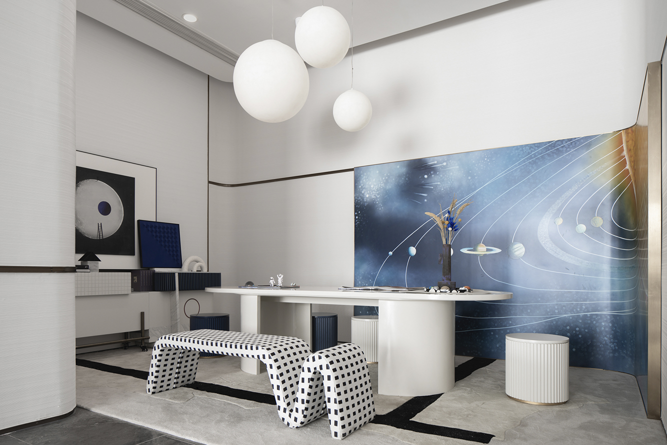步入干净简练的入口连廊,结合流线的空间线条放上以“星空”为主题的曲面画作,成为进入整个主体空间前的中心记忆点。