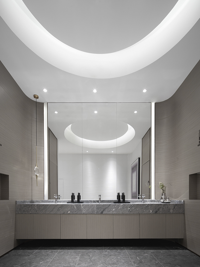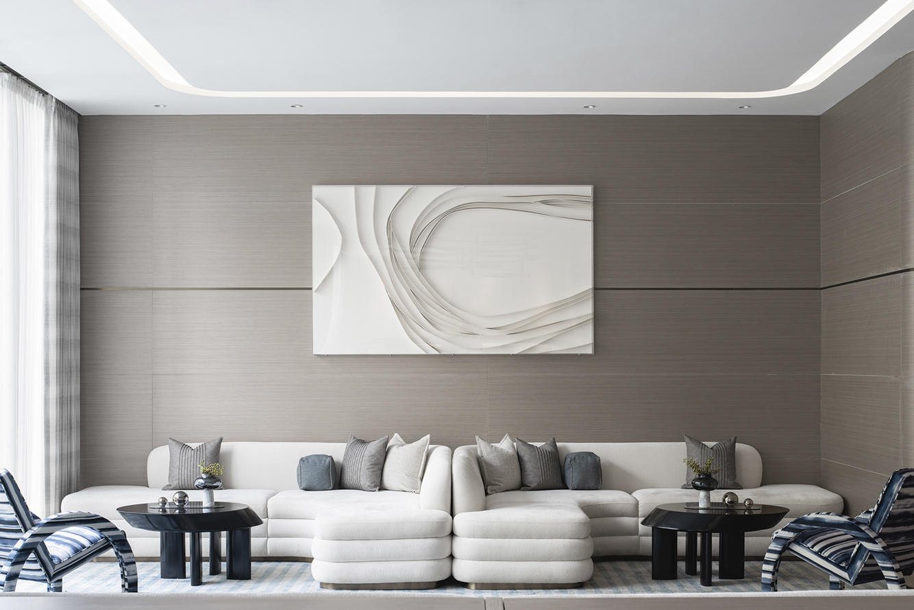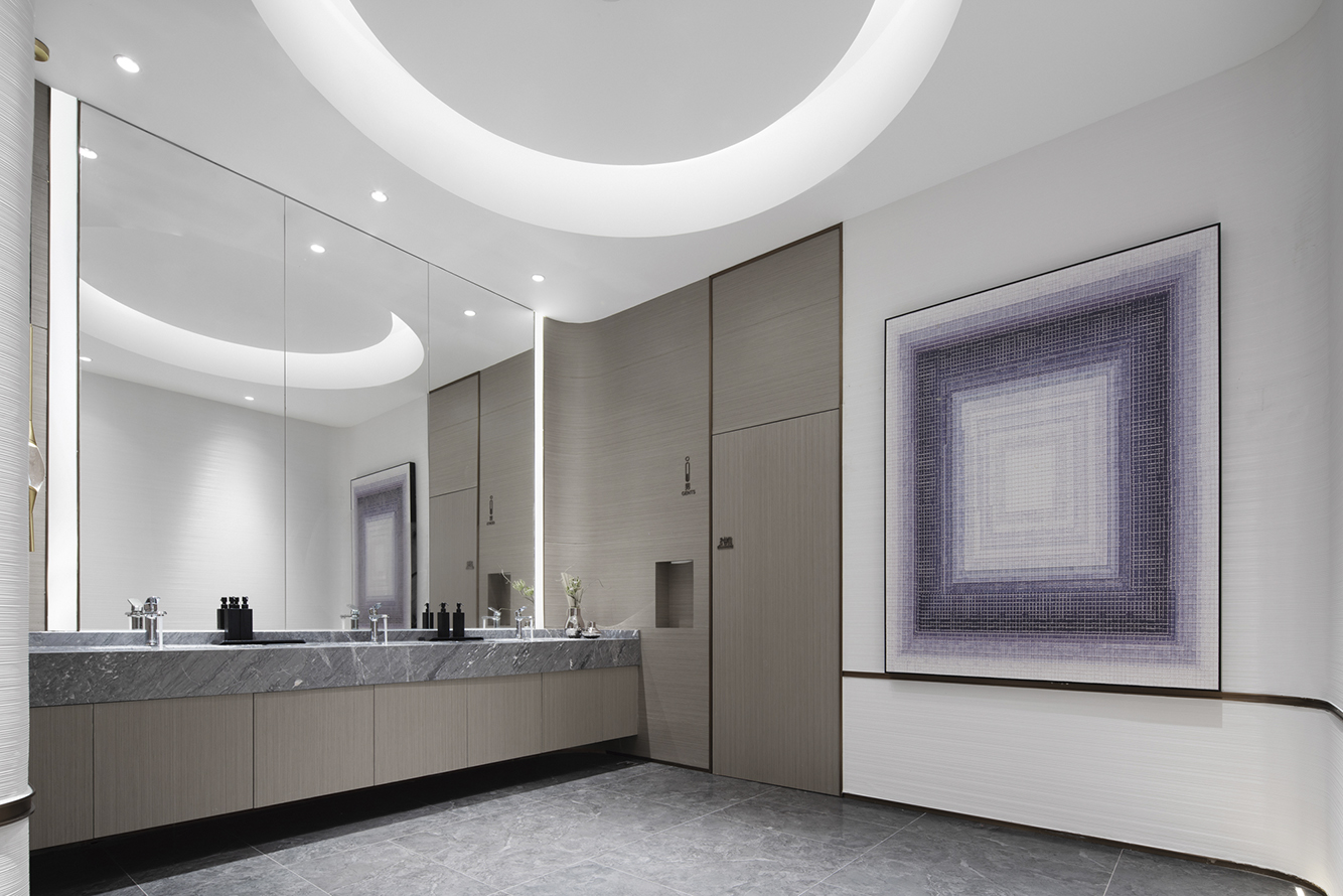 步入干净简练的入口连廊,结合流线的空间线条放上以“星空”为主题的曲面画作,成为进入整个主体空间前的中心记忆点。