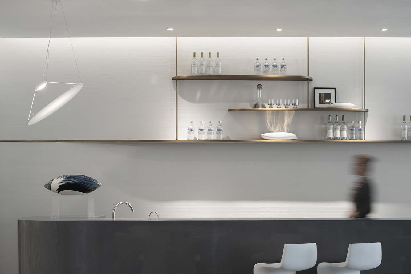 水吧区融入在主洽谈区视线尽头,金色金属线条精致地描出纤细流线轮廓,在安静和开阔之处极其富有格调。