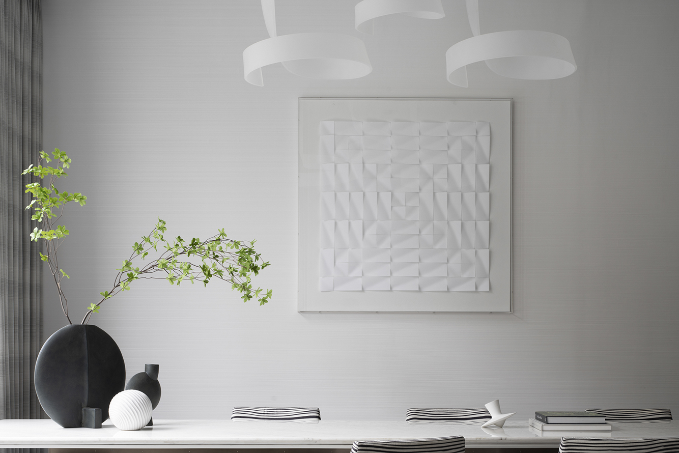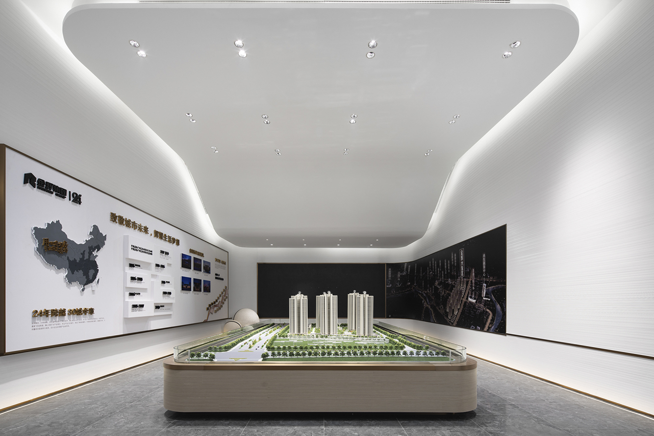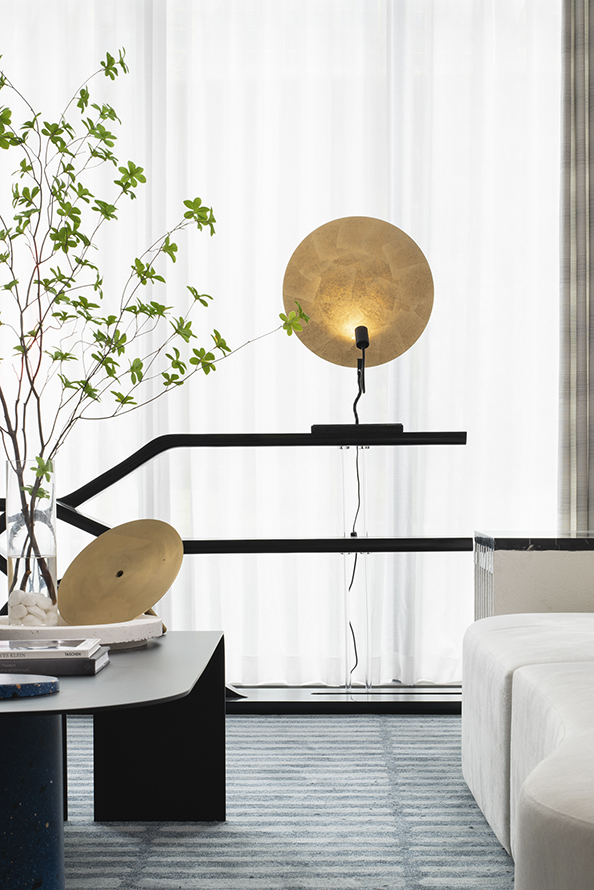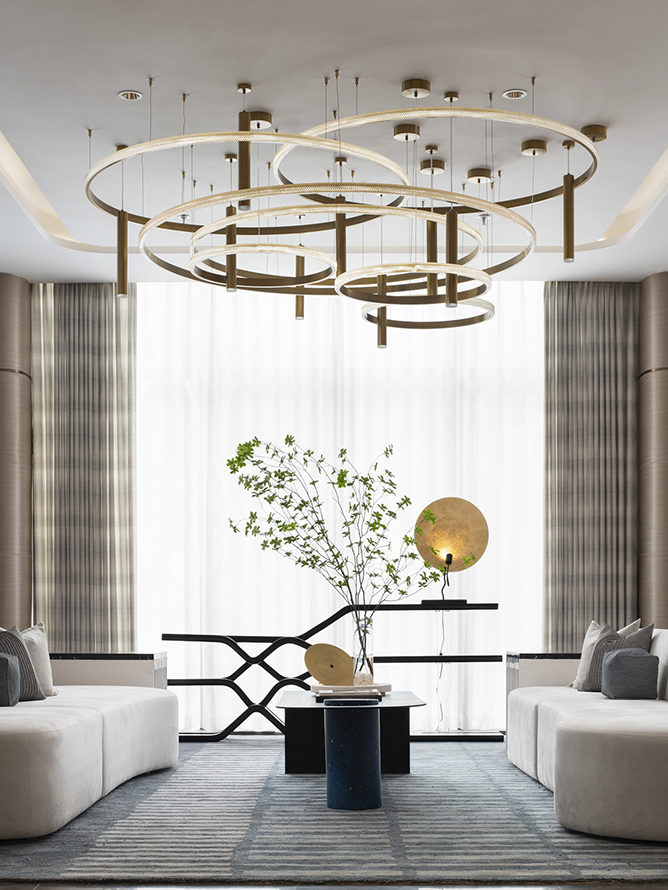 在本案中,我们在基于福清当地的城市发展的文脉及印象文化背景下,提取福清“尤溪梯田”元素为设计起源,以“将天上的光亮引用到地面”作为引子,用艺术提取后具象化设计融入到整个营销中心的软装设计中。